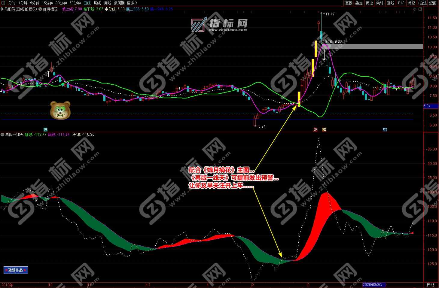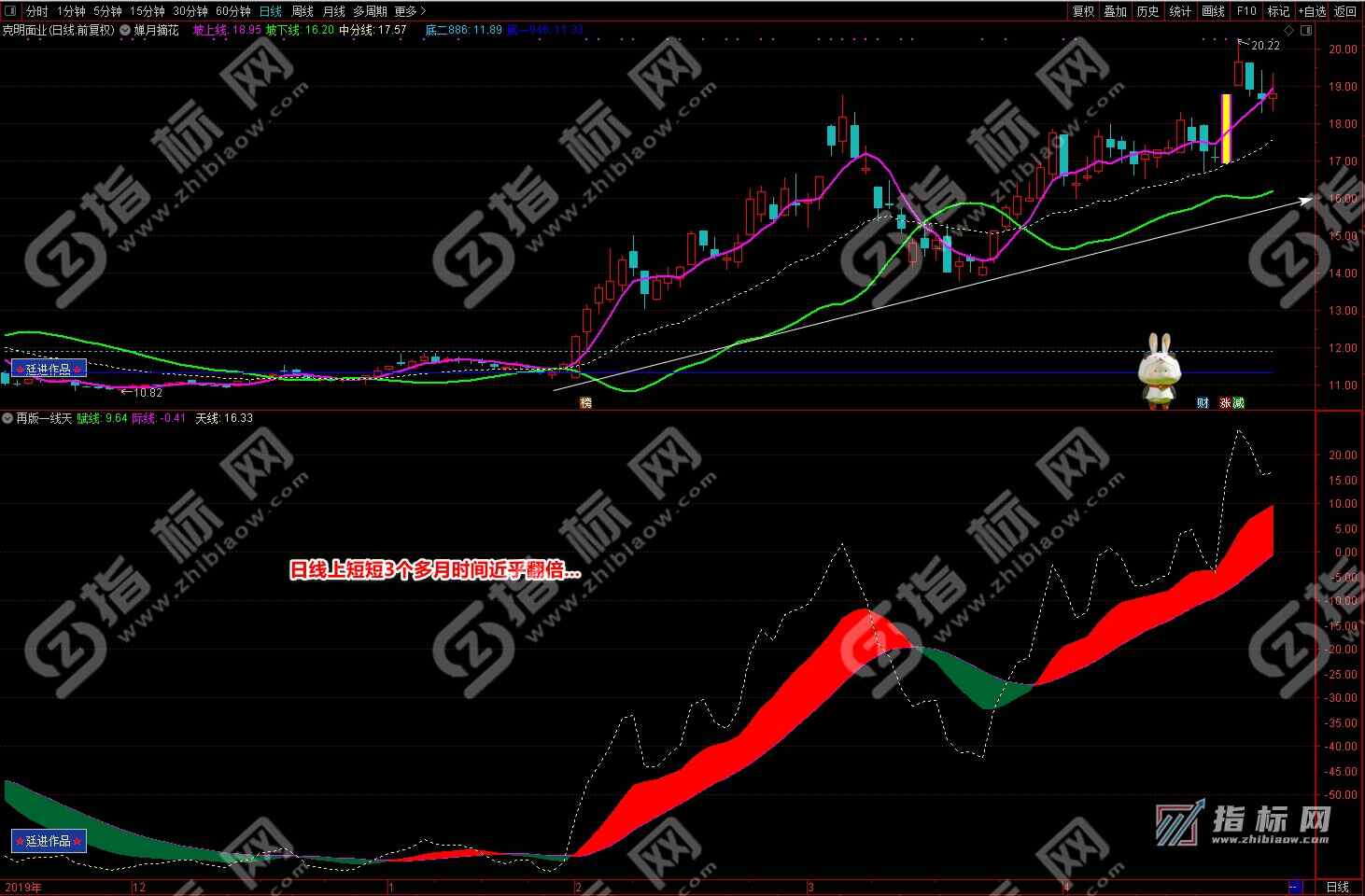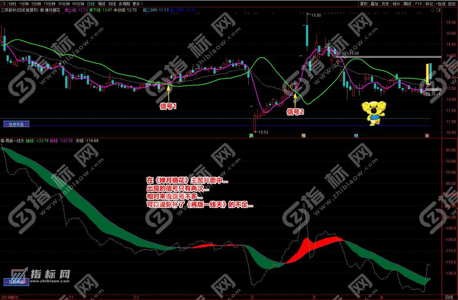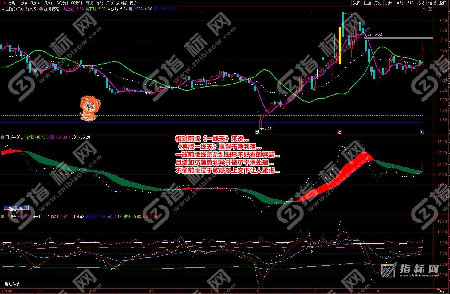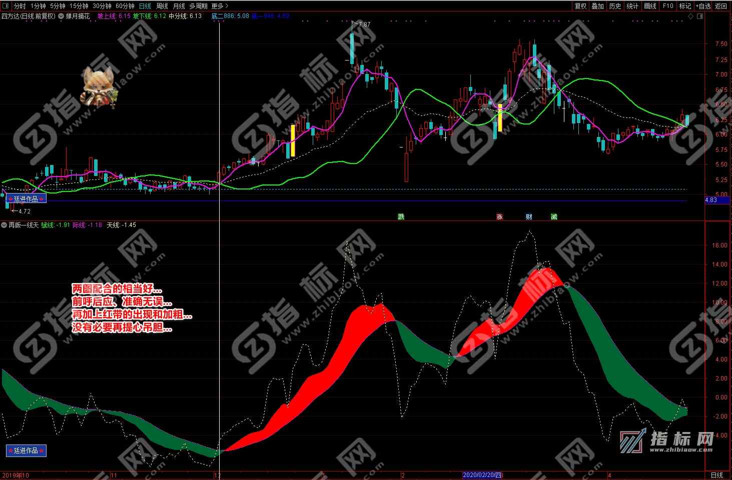 通达信婵月摘花主图与再版一线天副图相互呼应信号共振更能验证信号的准确性。再版一线天副图指标一改之前版本线条杂乱图形不好看的弊端,并增加了趋势流上升下降趋势更加一目了然。