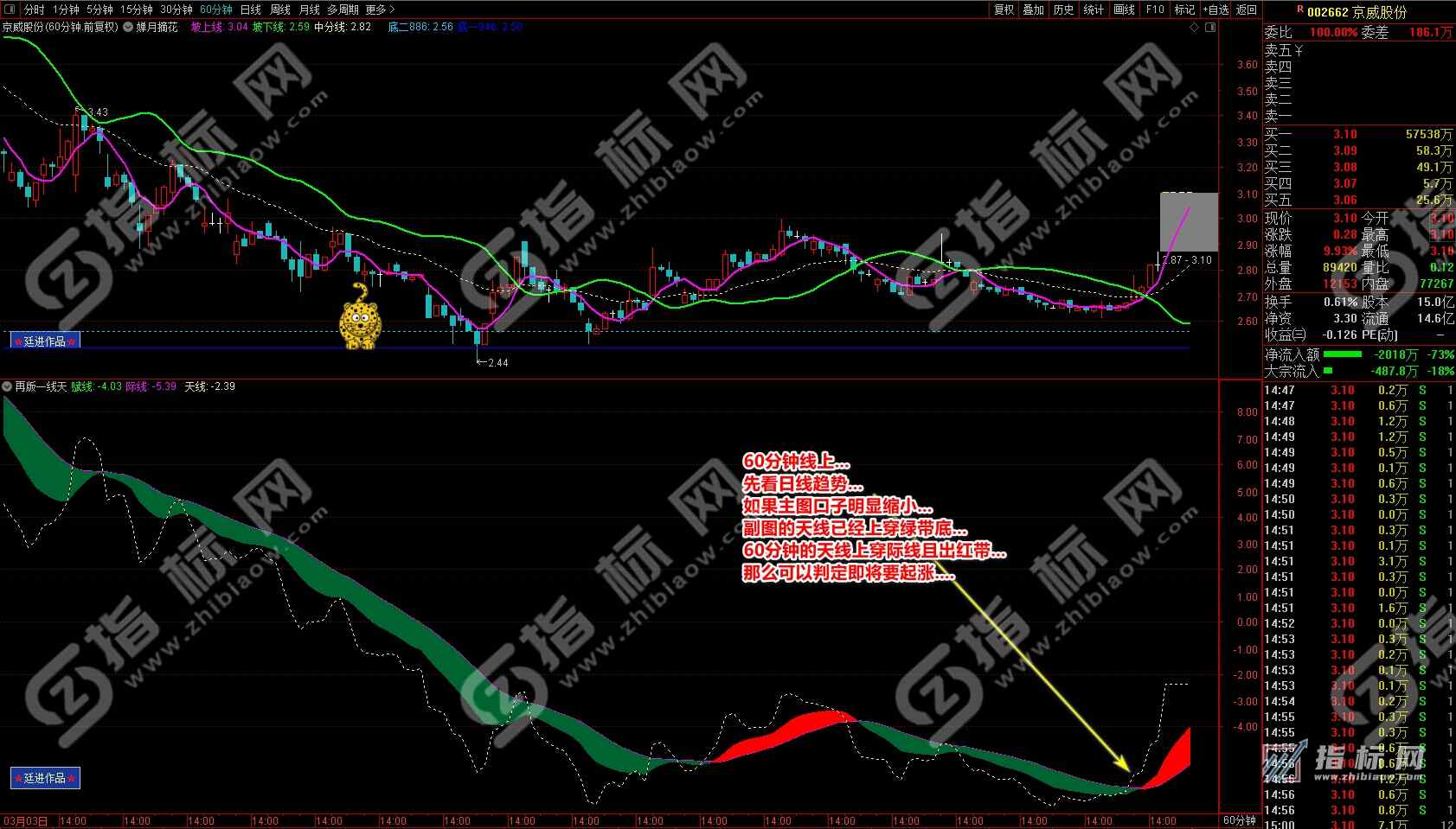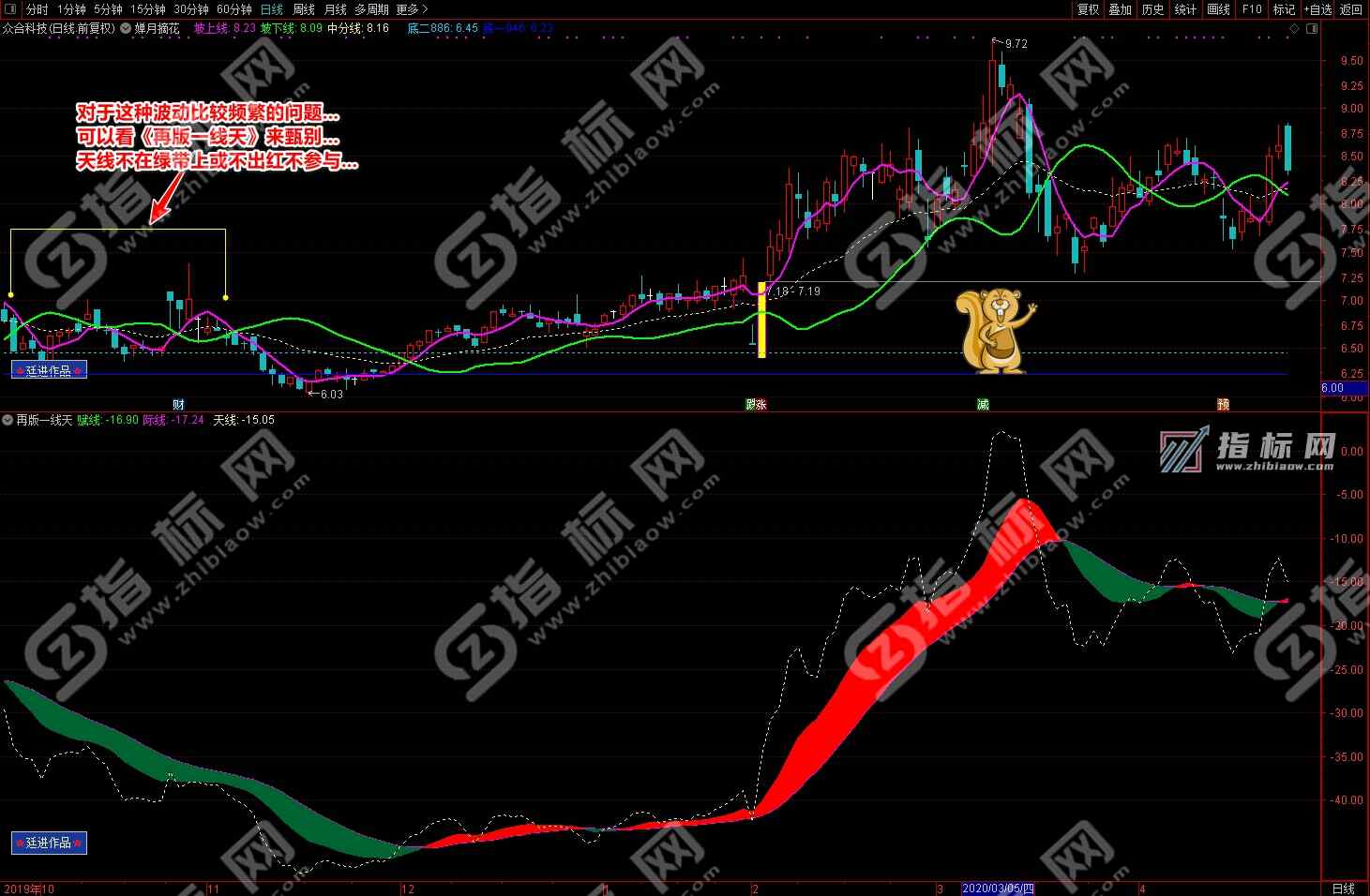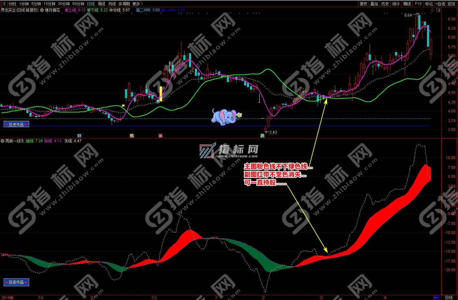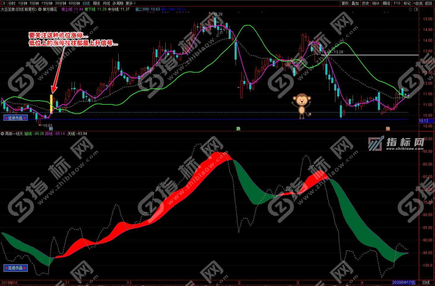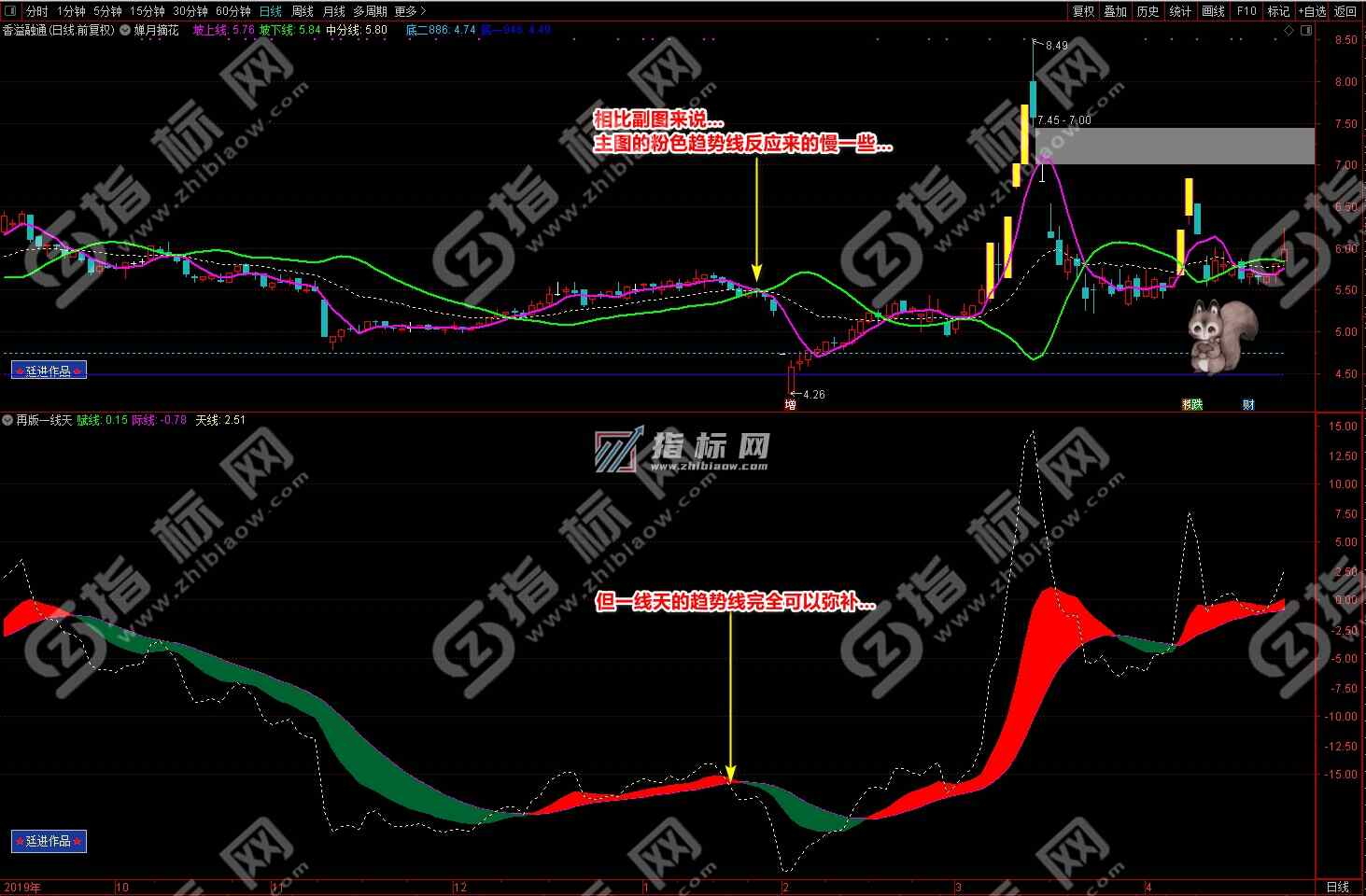 通达信婵月摘花主图与再版一线天副图相互呼应信号共振更能验证信号的准确性。再版一线天副图指标一改之前版本线条杂乱图形不好看的弊端,并增加了趋势流上升下降趋势更加一目了然。