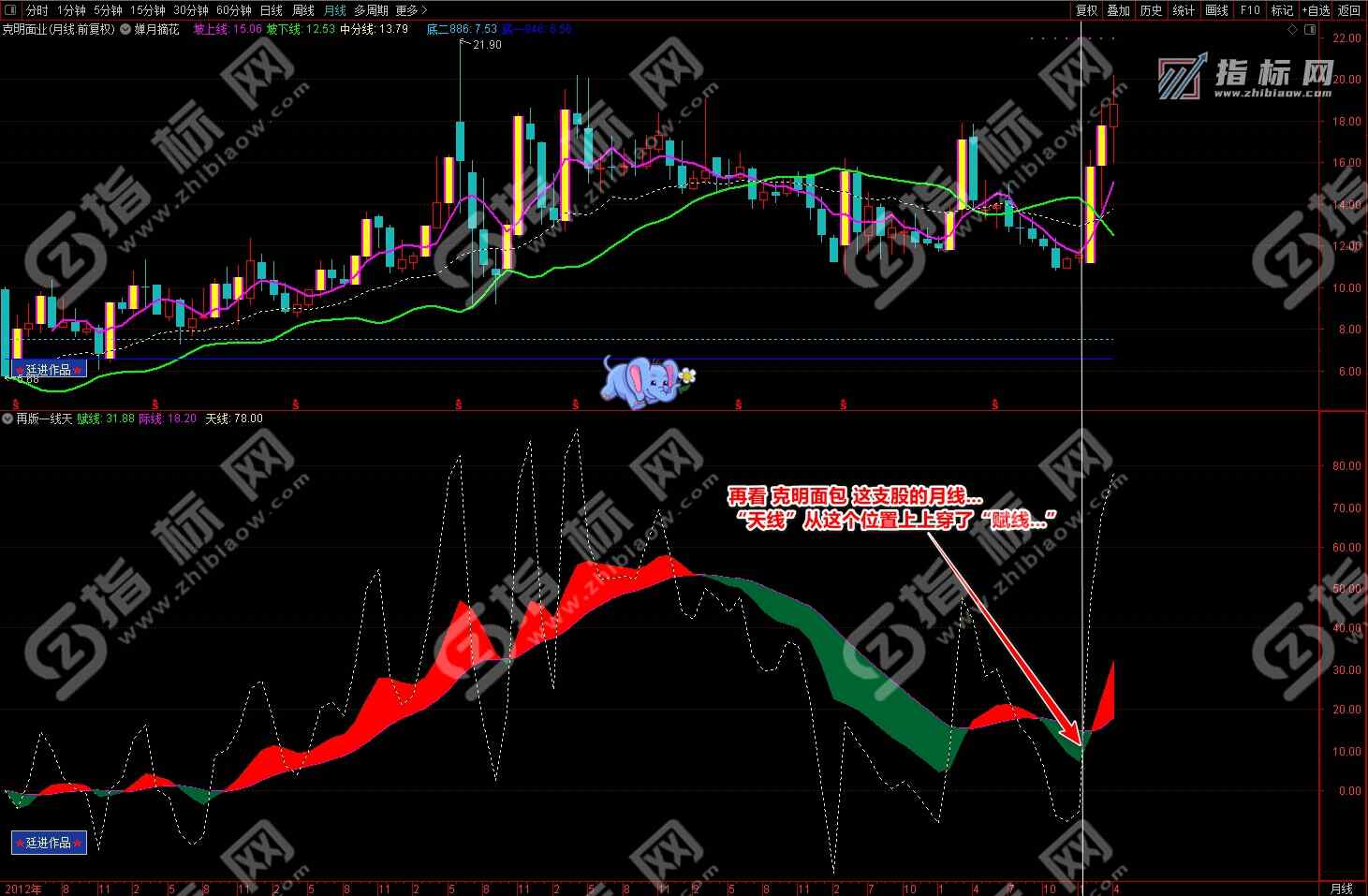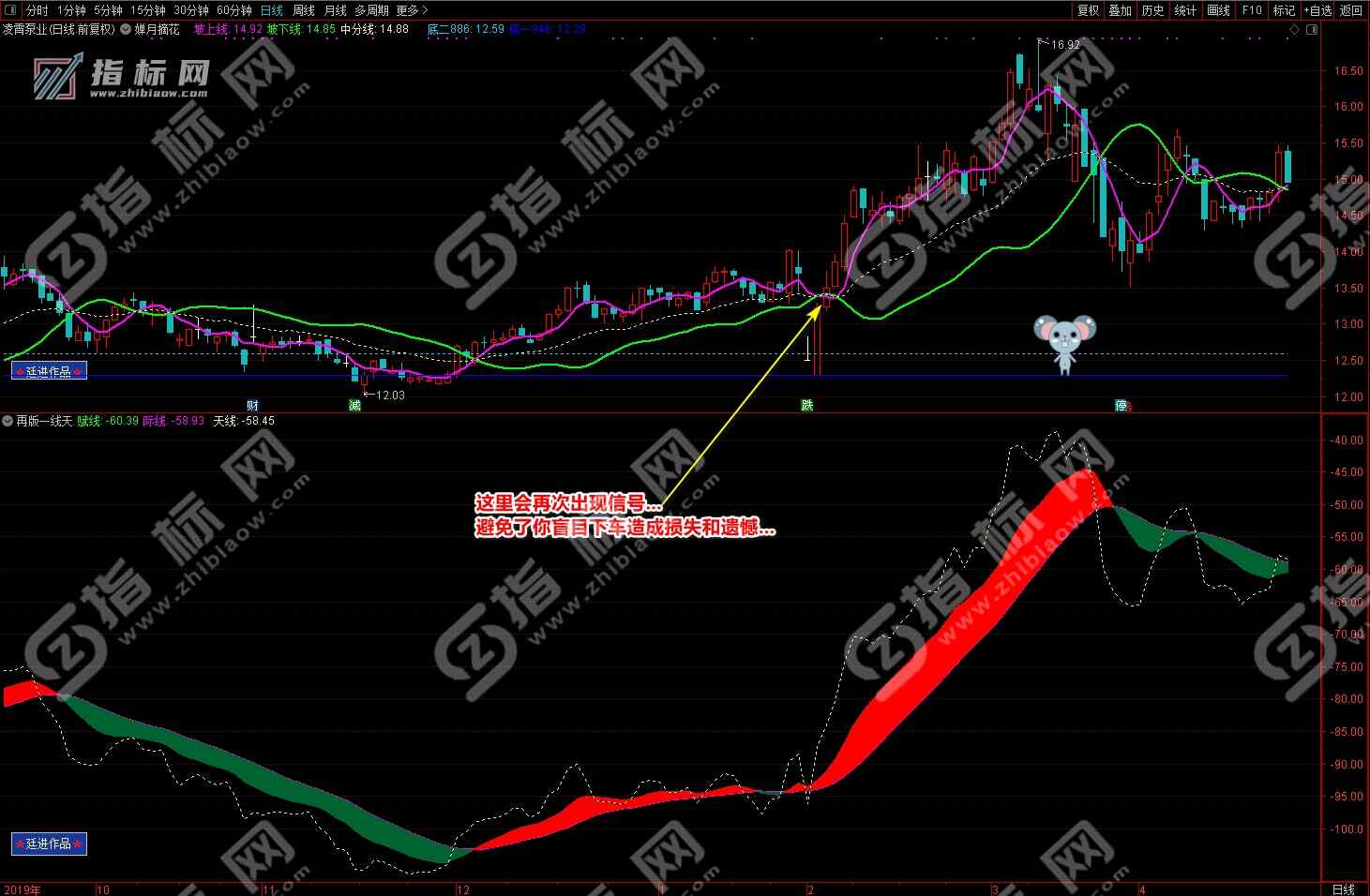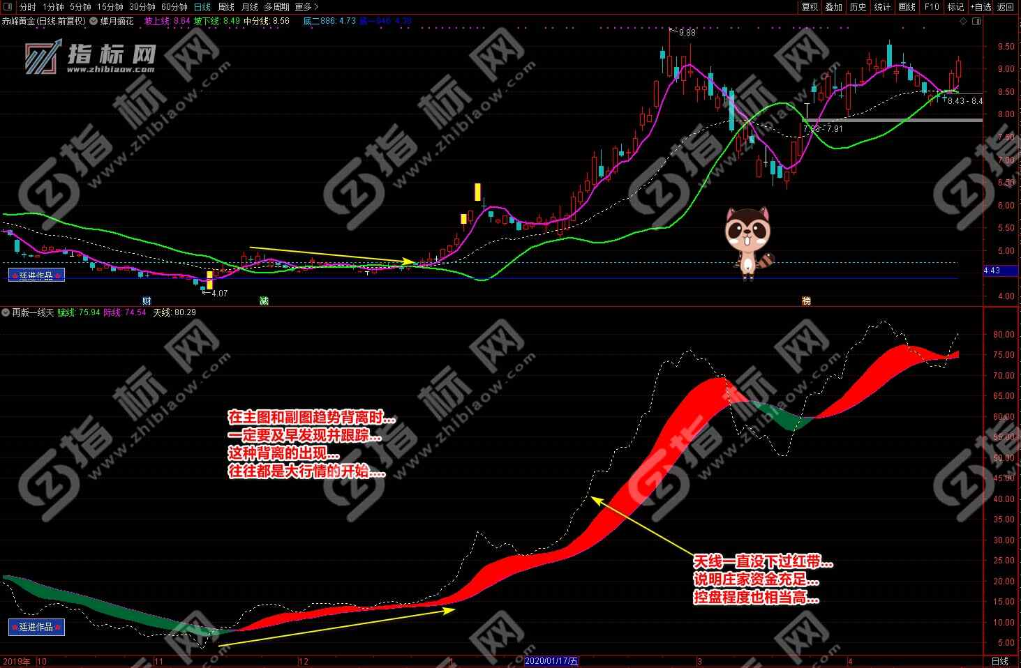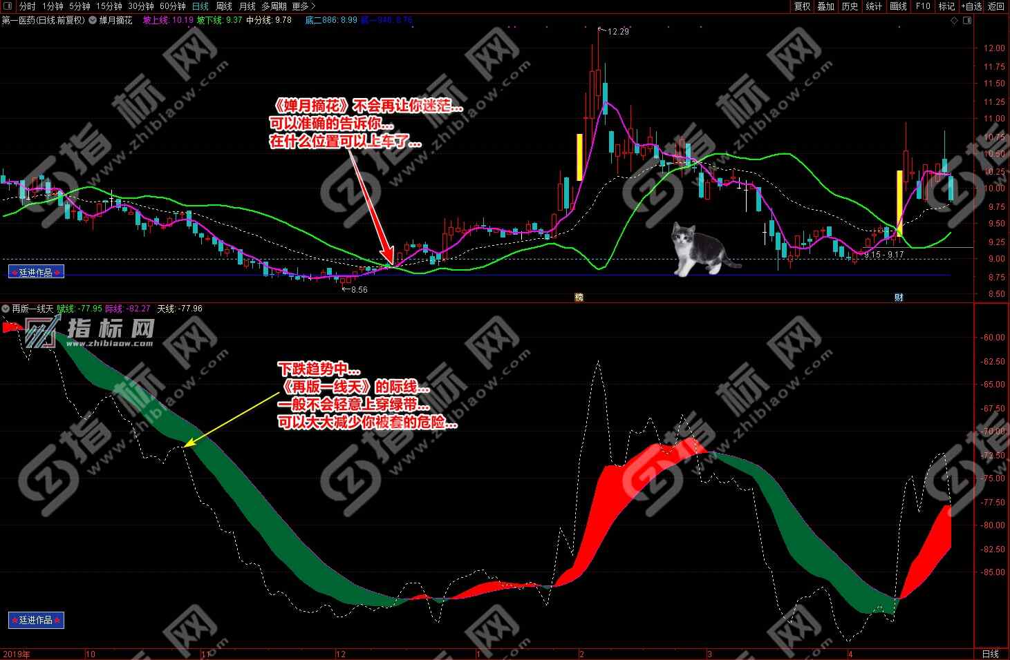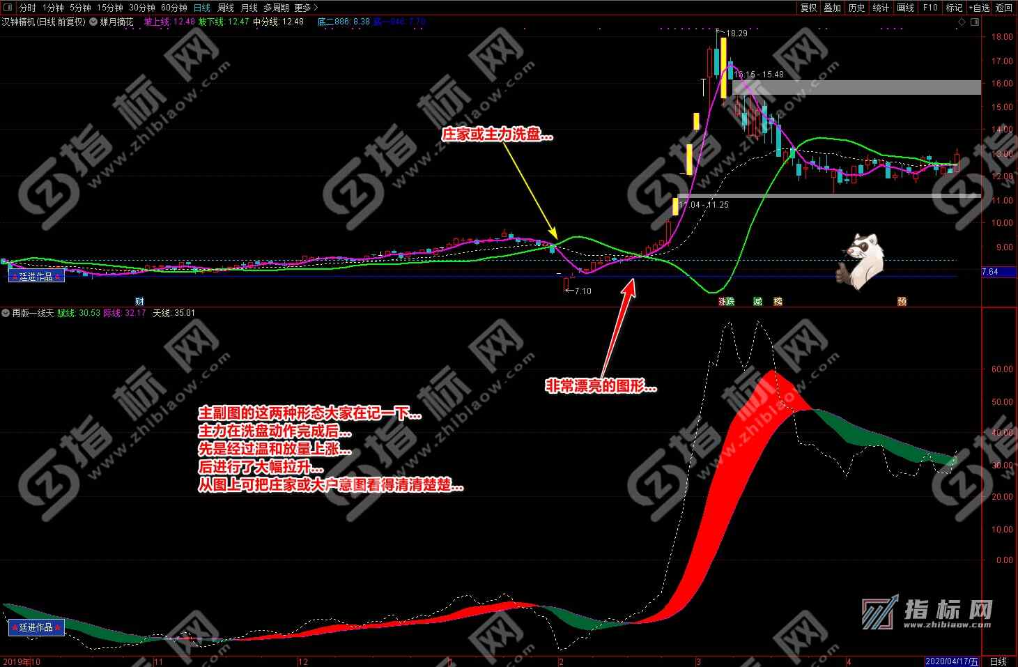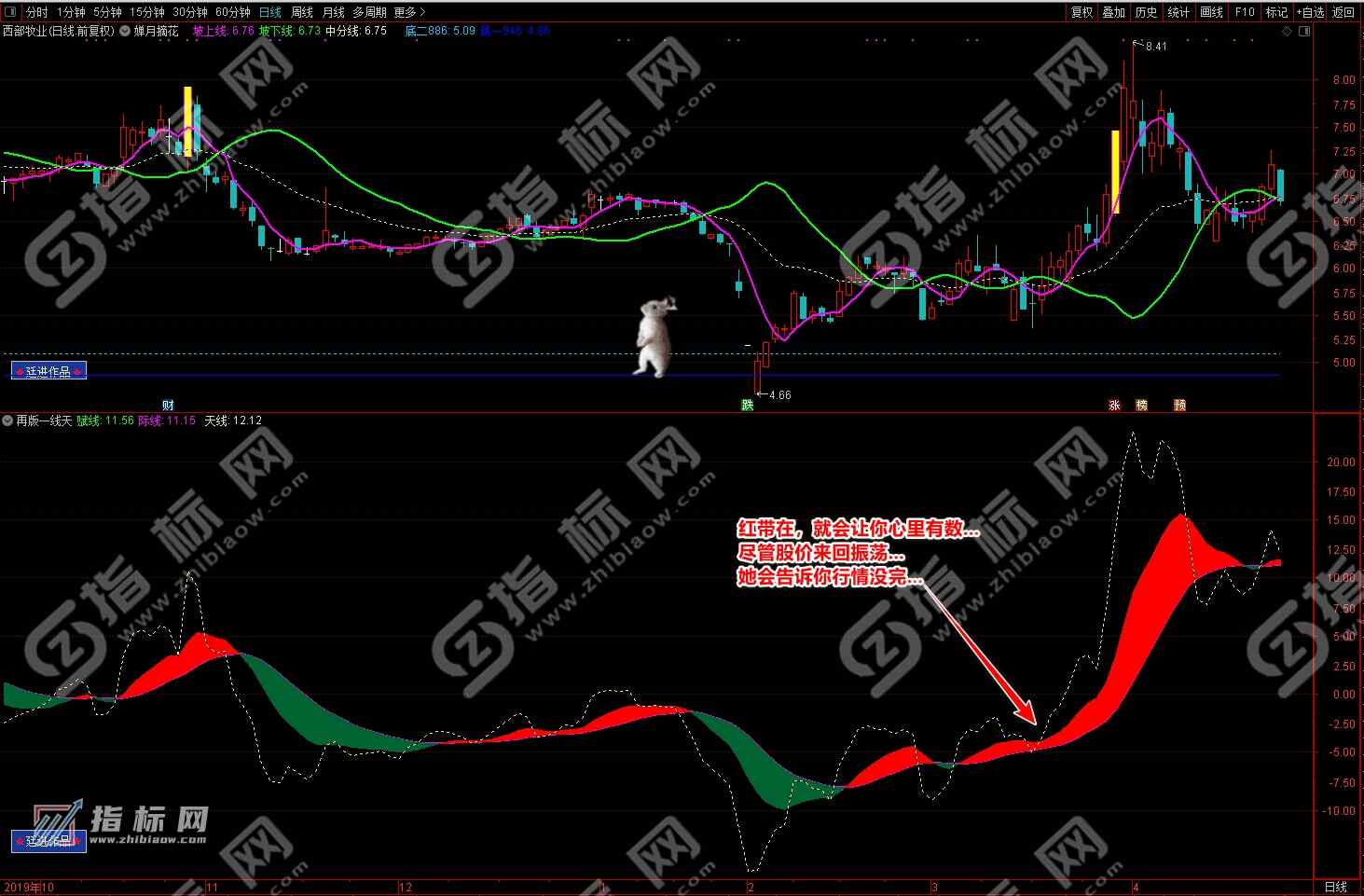 通达信婵月摘花主图与再版一线天副图相互呼应信号共振更能验证信号的准确性。再版一线天副图指标一改之前版本线条杂乱图形不好看的弊端,并增加了趋势流上升下降趋势更加一目了然。