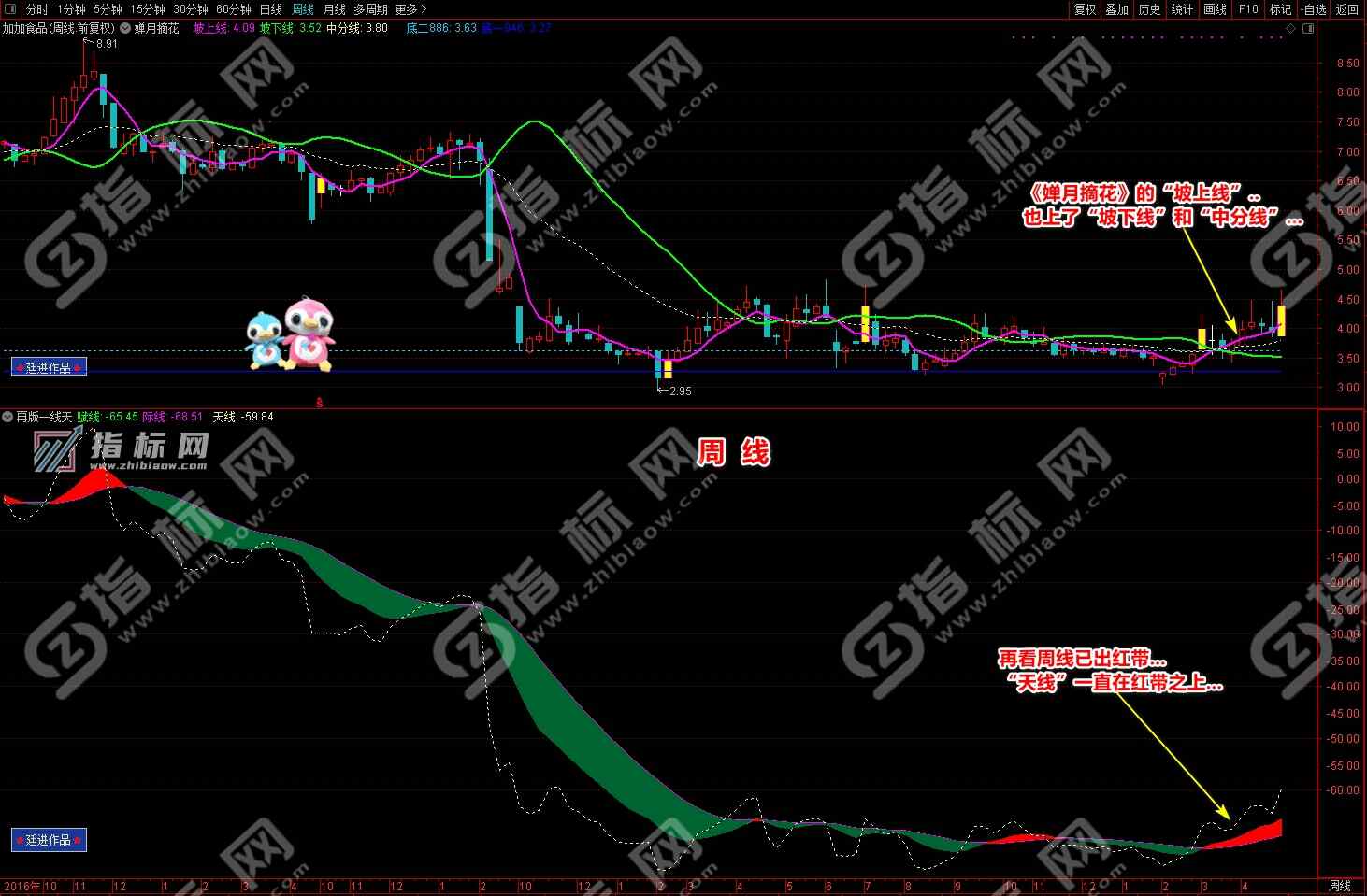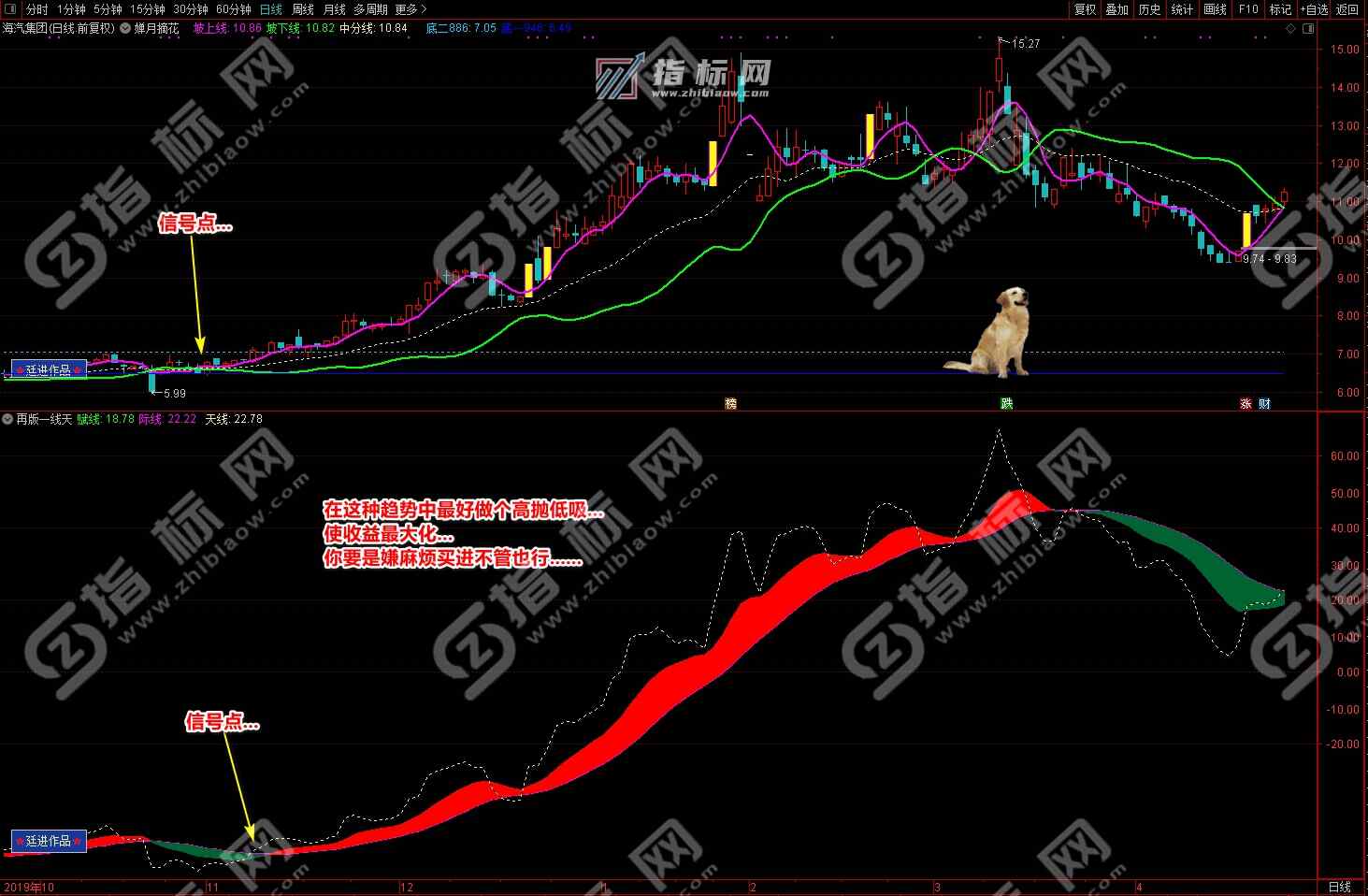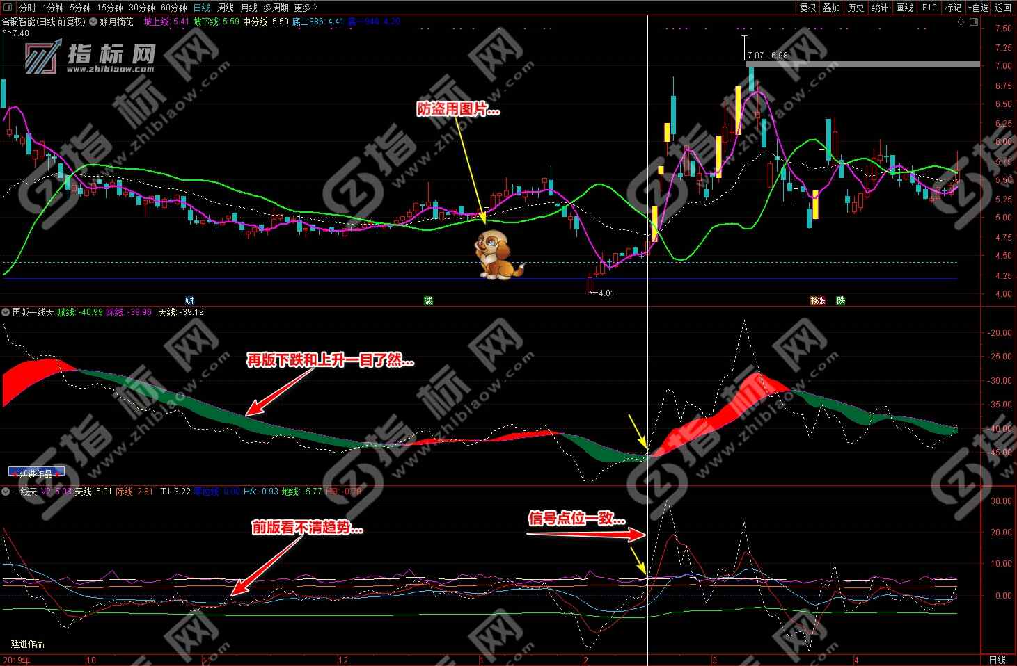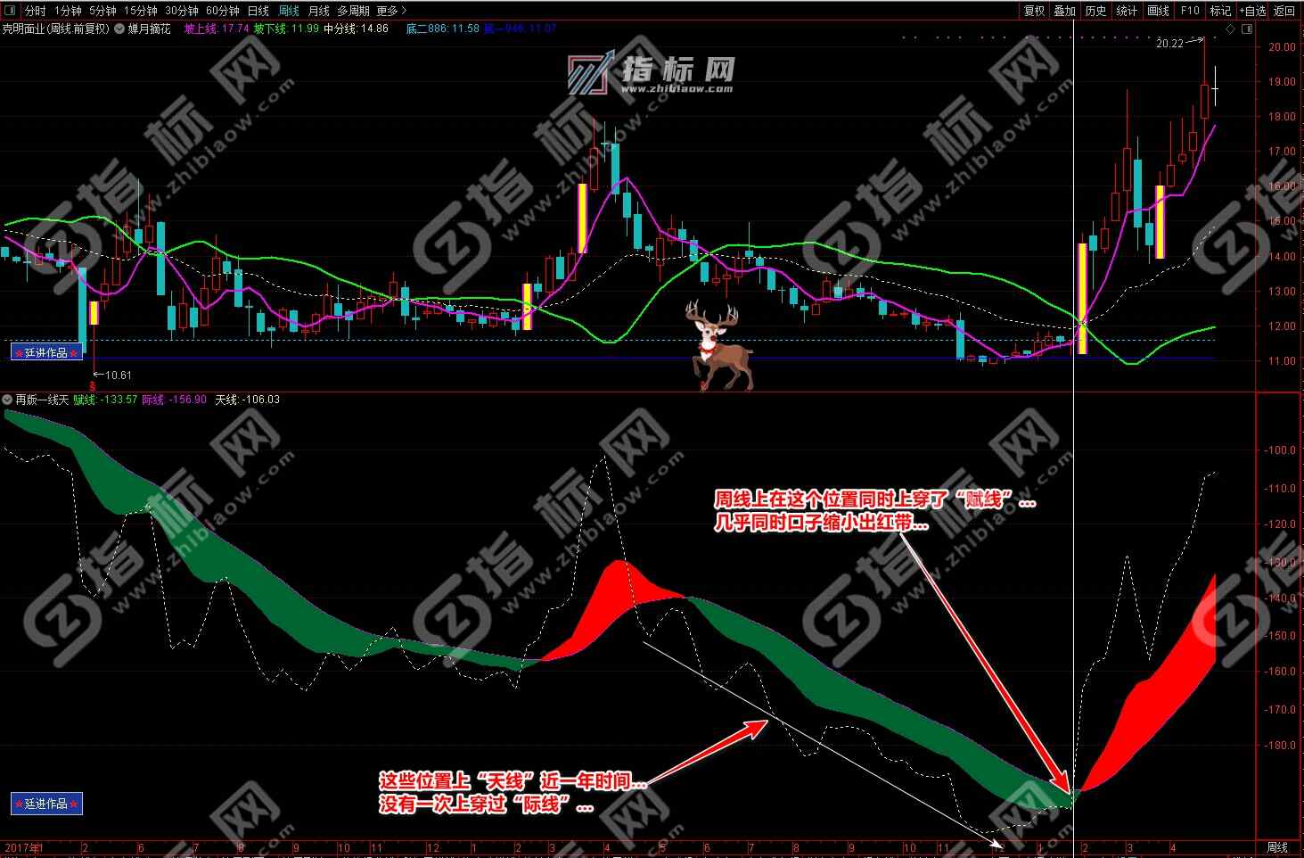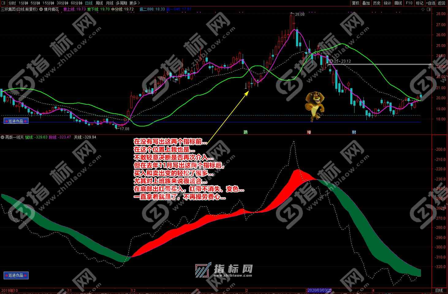 通达信婵月摘花主图与再版一线天副图相互呼应信号共振更能验证信号的准确性。再版一线天副图指标一改之前版本线条杂乱图形不好看的弊端,并增加了趋势流上升下降趋势更加一目了然。