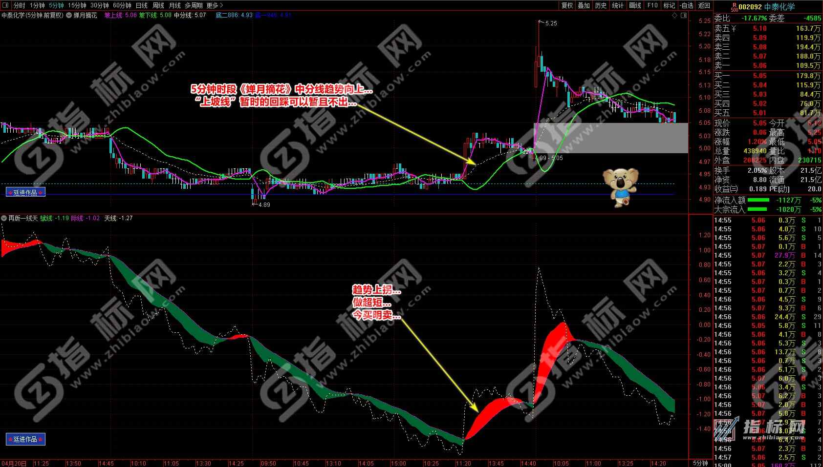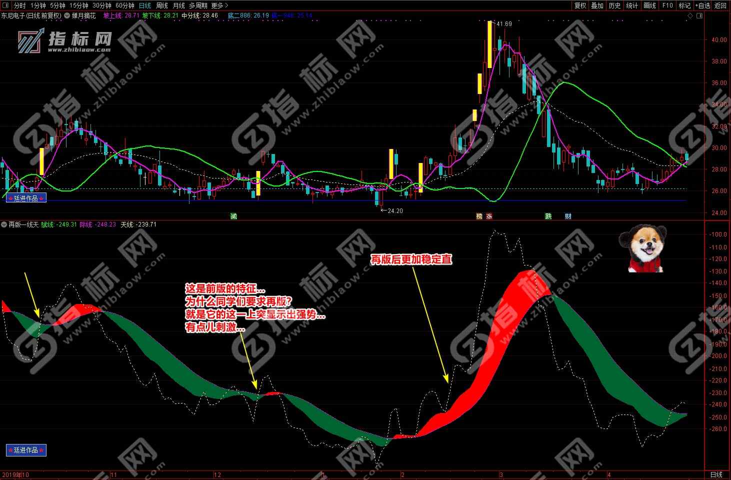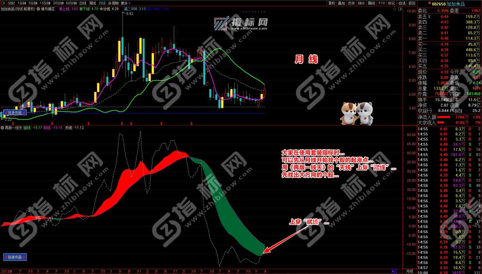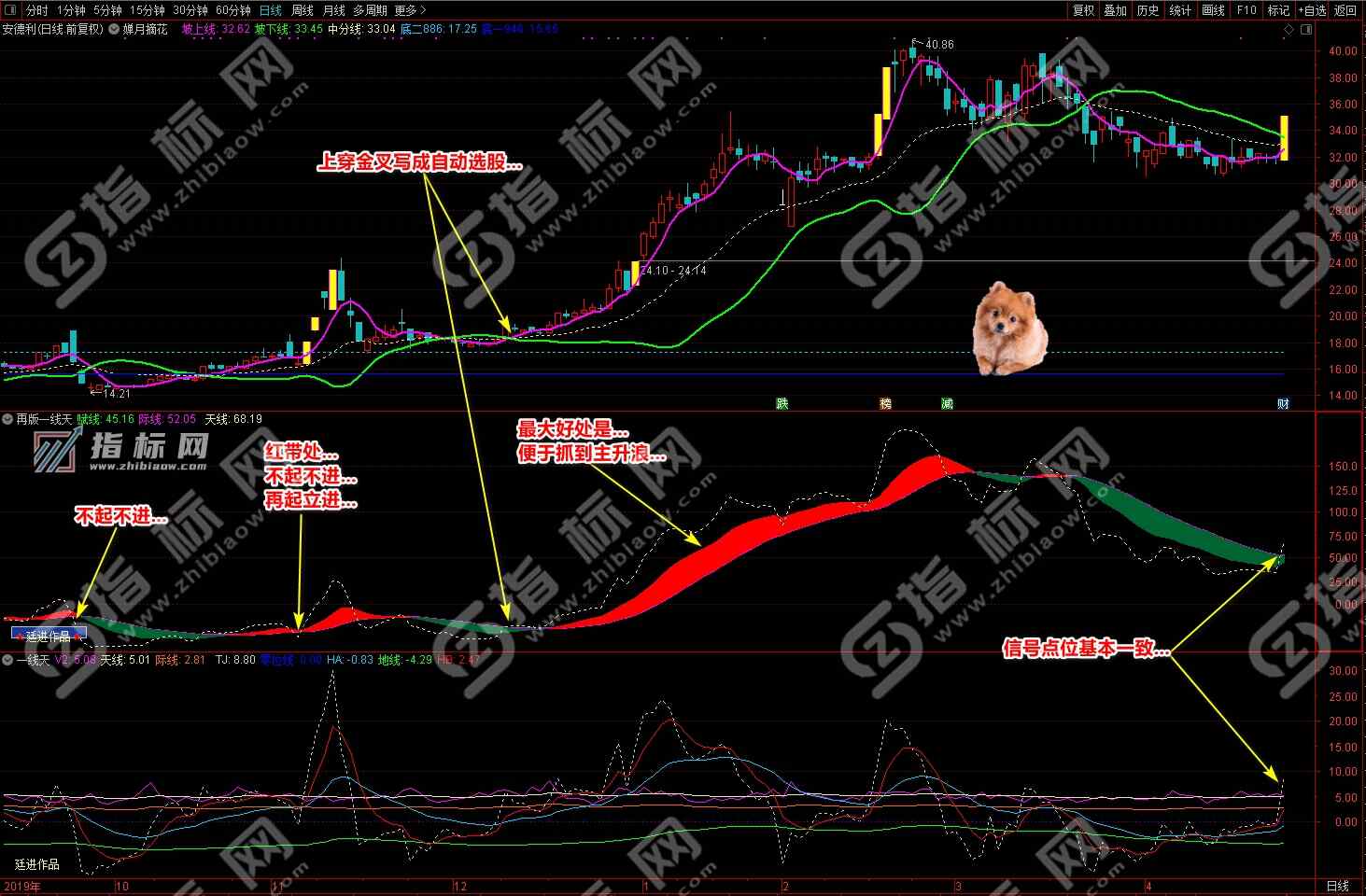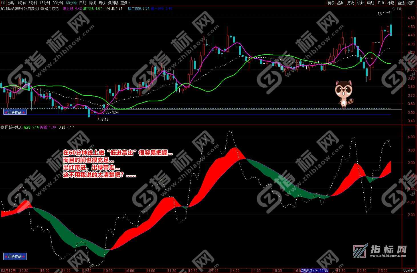 通达信婵月摘花主图与再版一线天副图相互呼应信号共振更能验证信号的准确性。再版一线天副图指标一改之前版本线条杂乱图形不好看的弊端,并增加了趋势流上升下降趋势更加一目了然。
