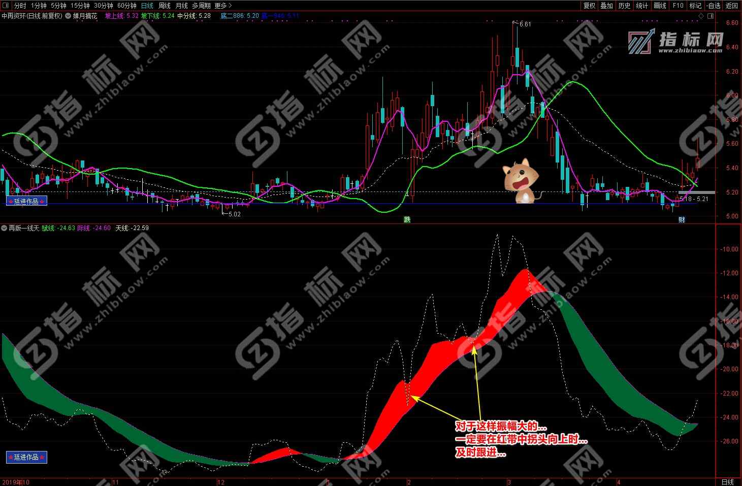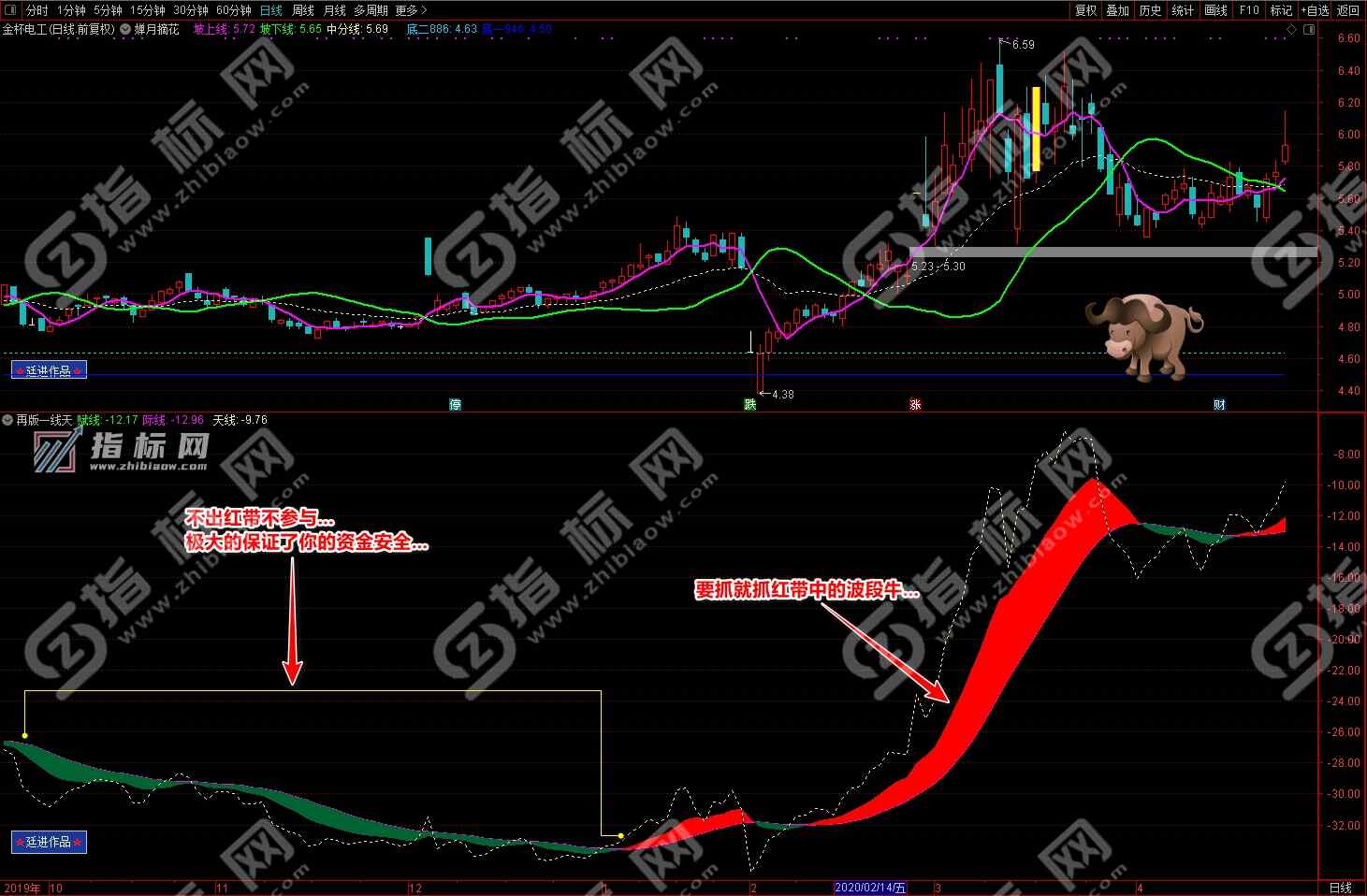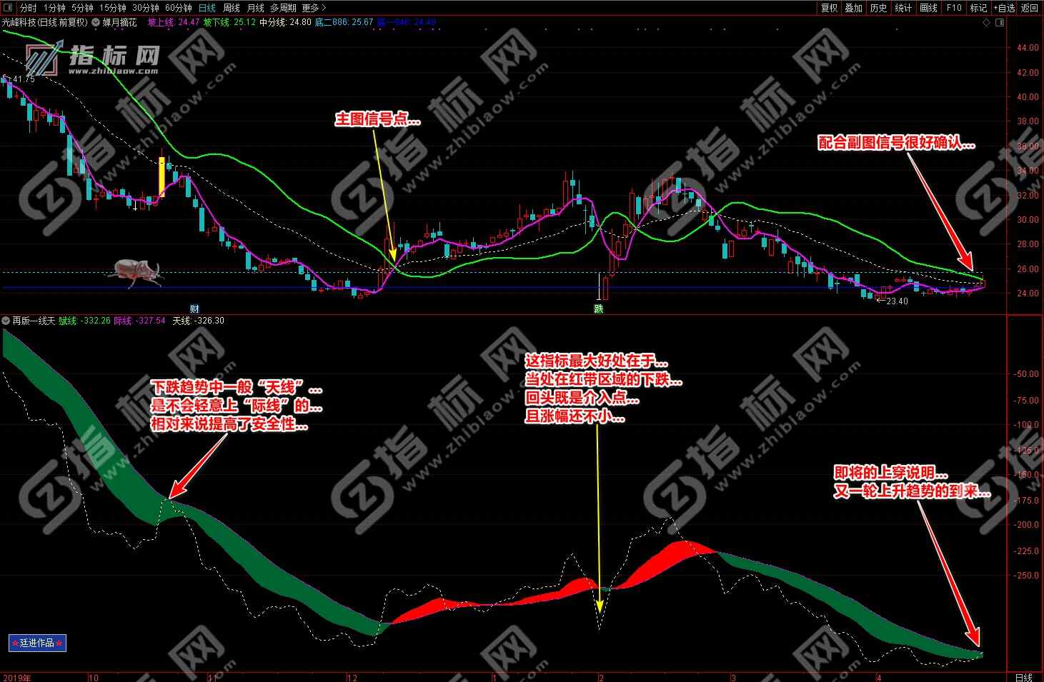 2.再版一线天副图指标有红色波段流和绿色波段流赋线(绿色)、际线(紫色)、天线(黄色虚线)组组成,红色波段代表趋势向上的上升趋势、相反绿色波段流代表向下的下降趋势;