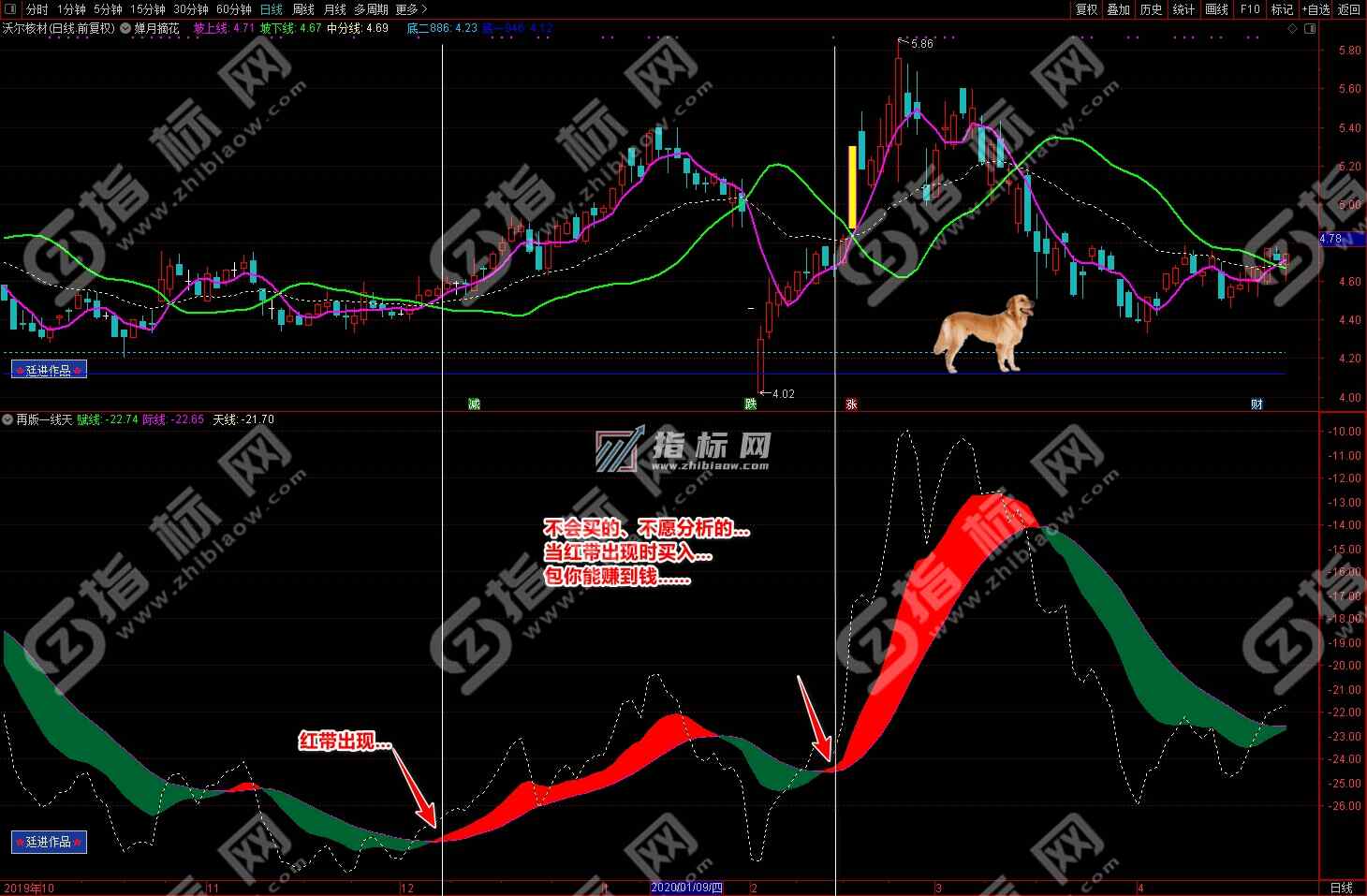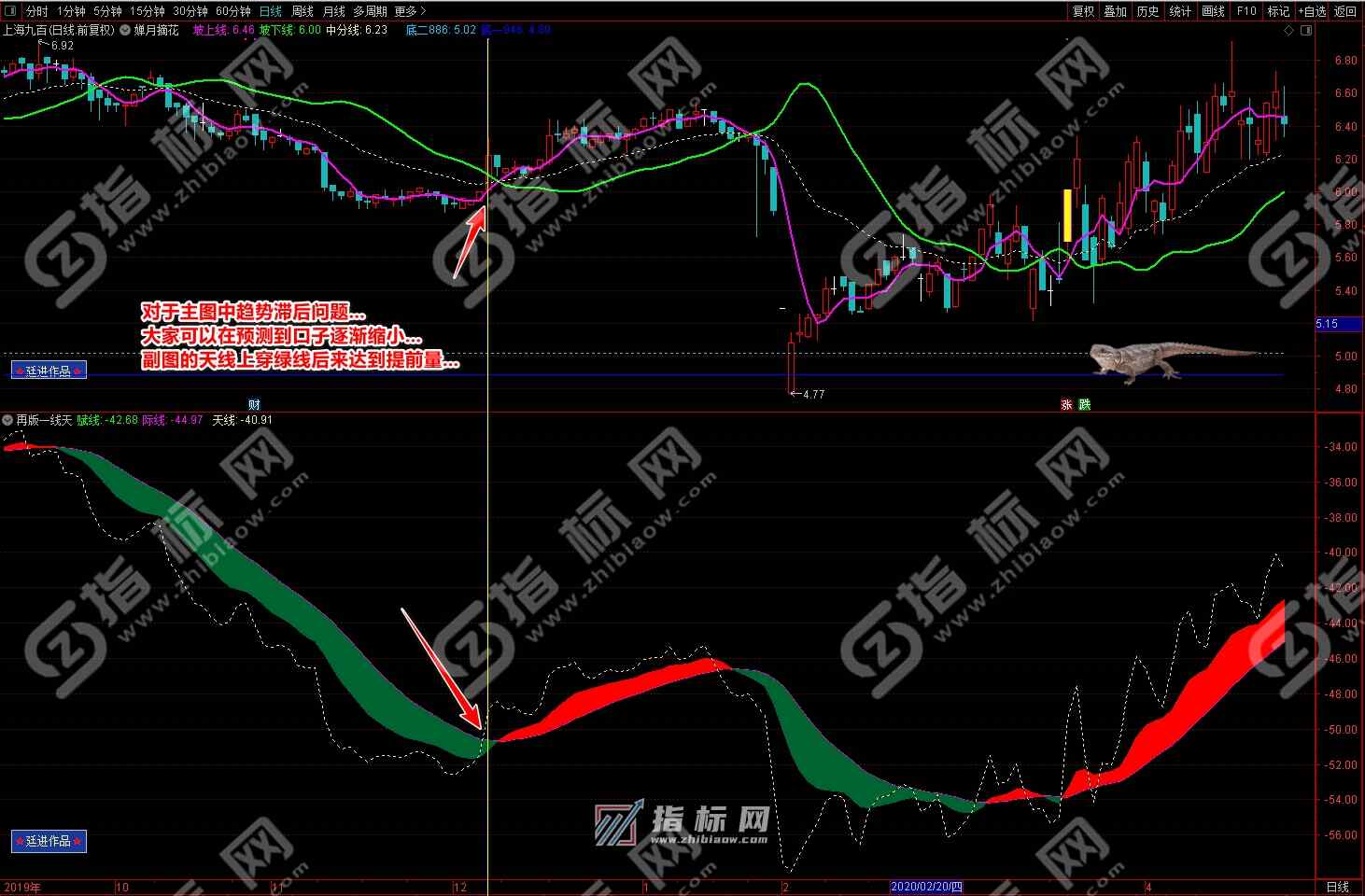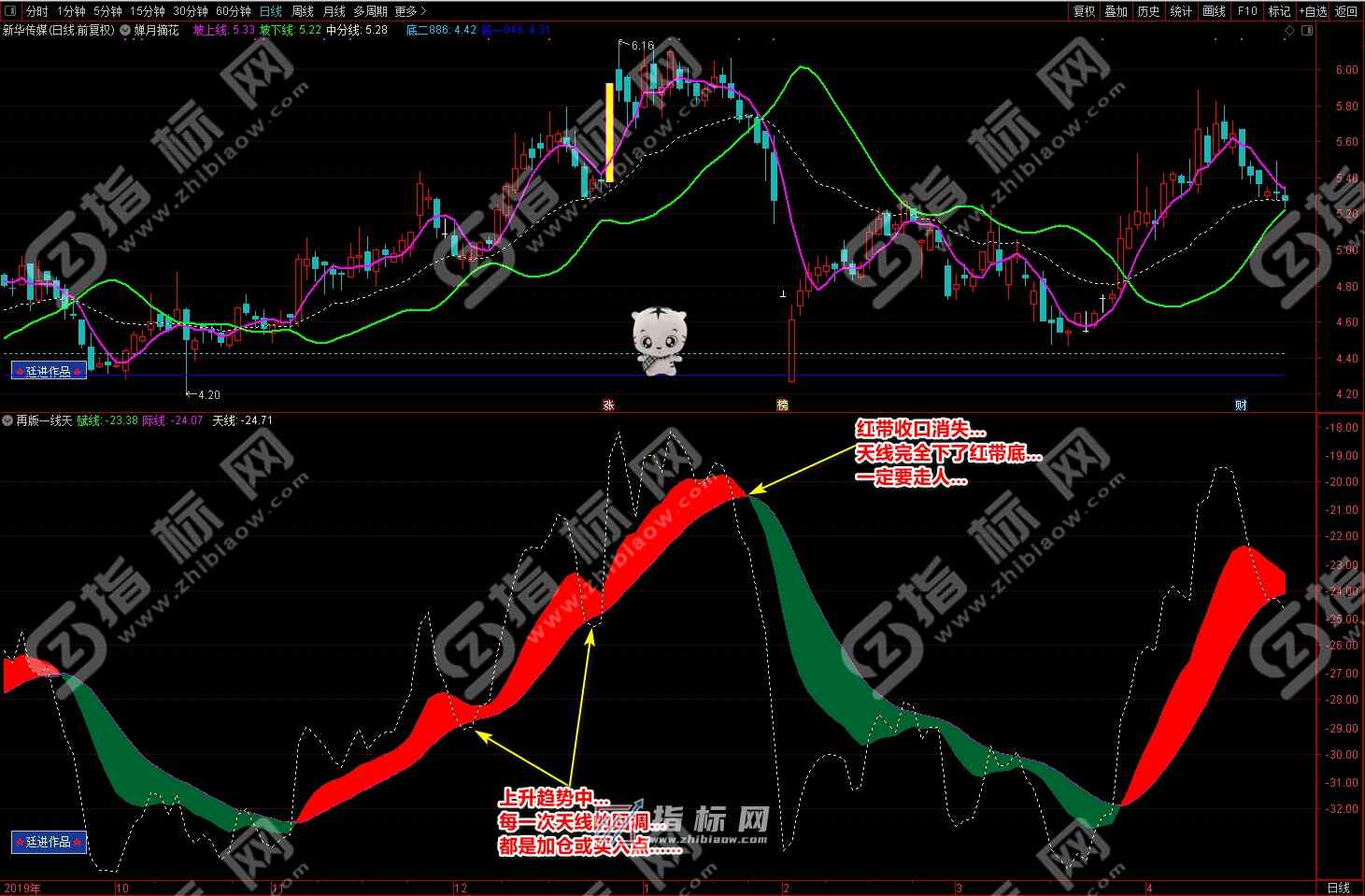 2.再版一线天副图指标有红色波段流和绿色波段流赋线(绿色)、际线(紫色)、天线(黄色虚线)组组成,红色波段代表趋势向上的上升趋势、相反绿色波段流代表向下的下降趋势;
