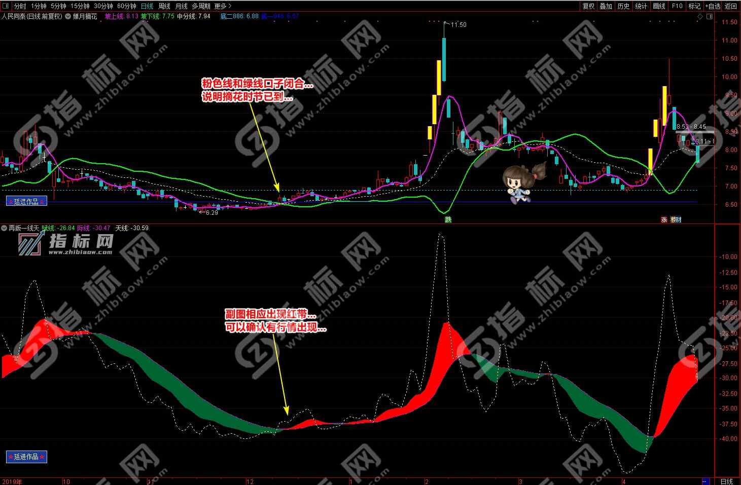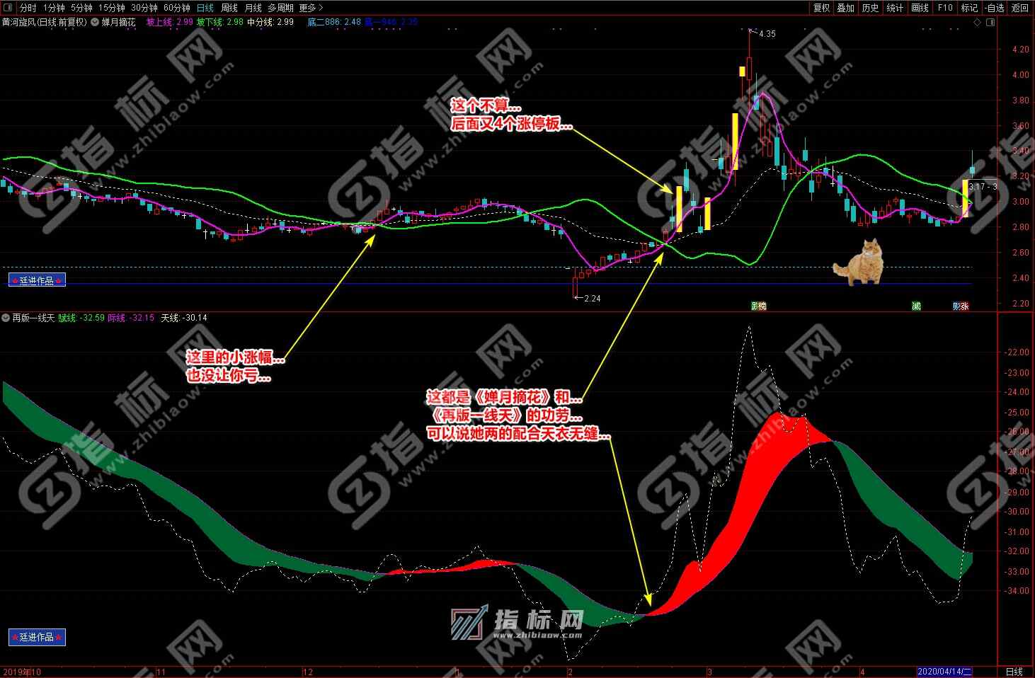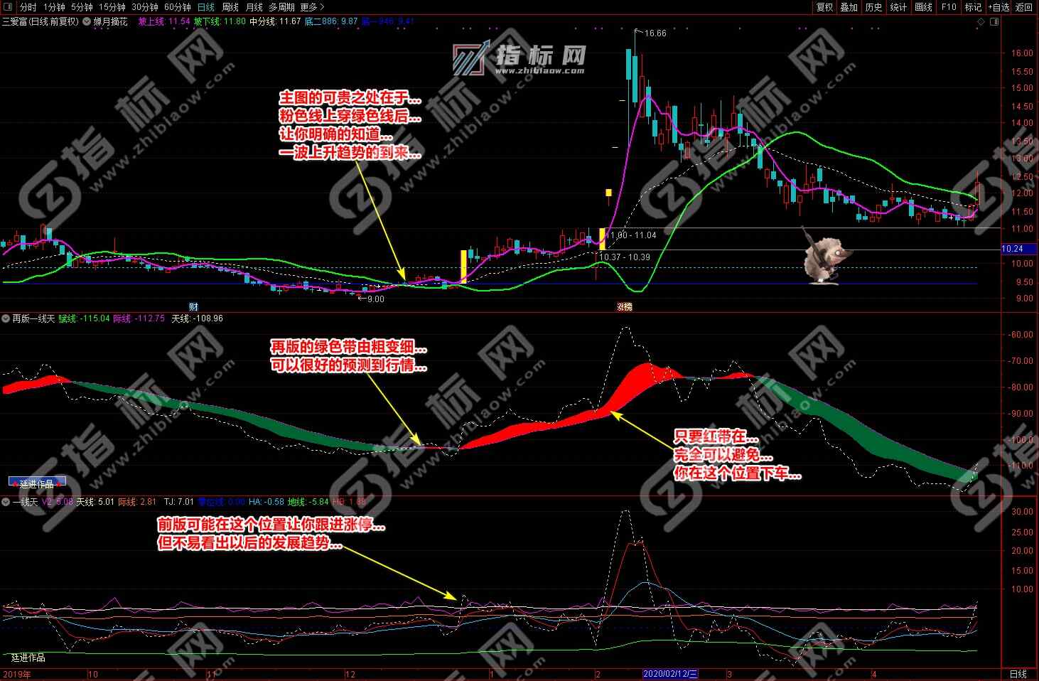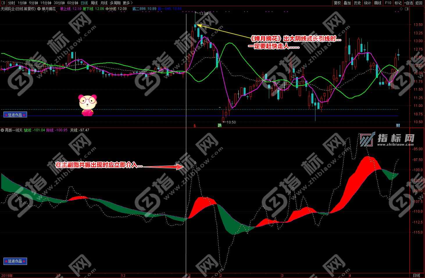 3.买点:婵月摘花主图中紫色的坡上线上穿绿色的坡下线形成金叉与再版一线天副图中黄色的天线上穿波段流(绿波段或红波段)形成共振信号,择机买入;