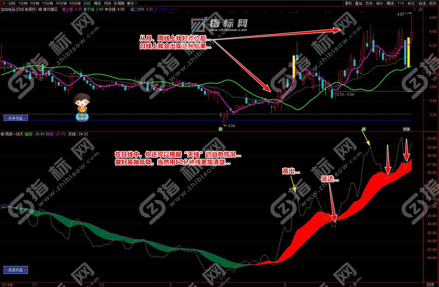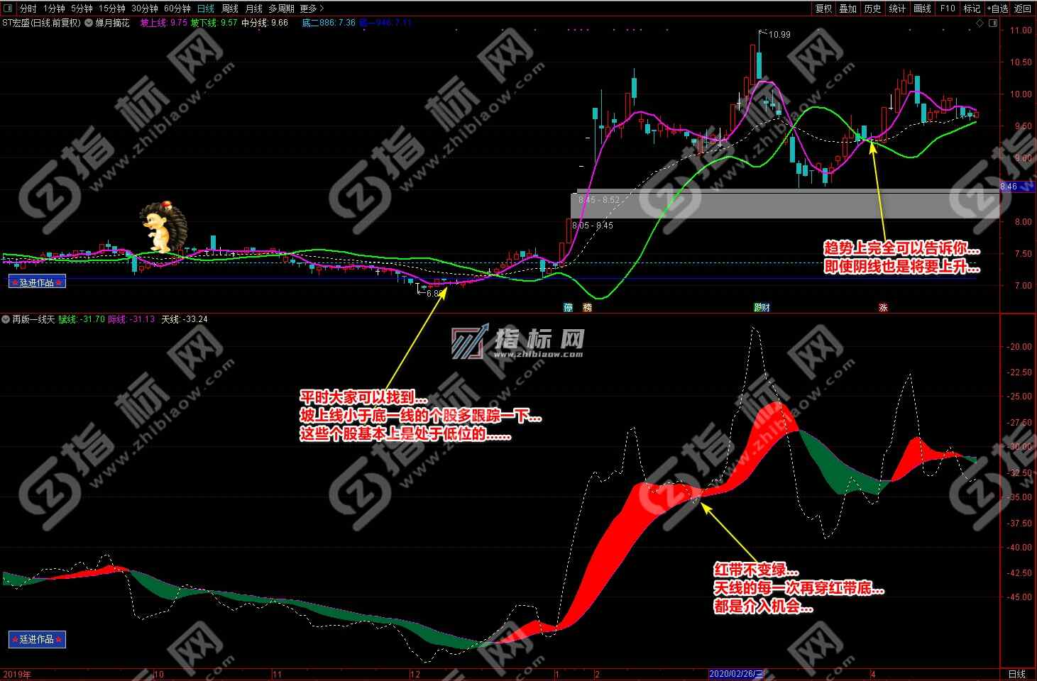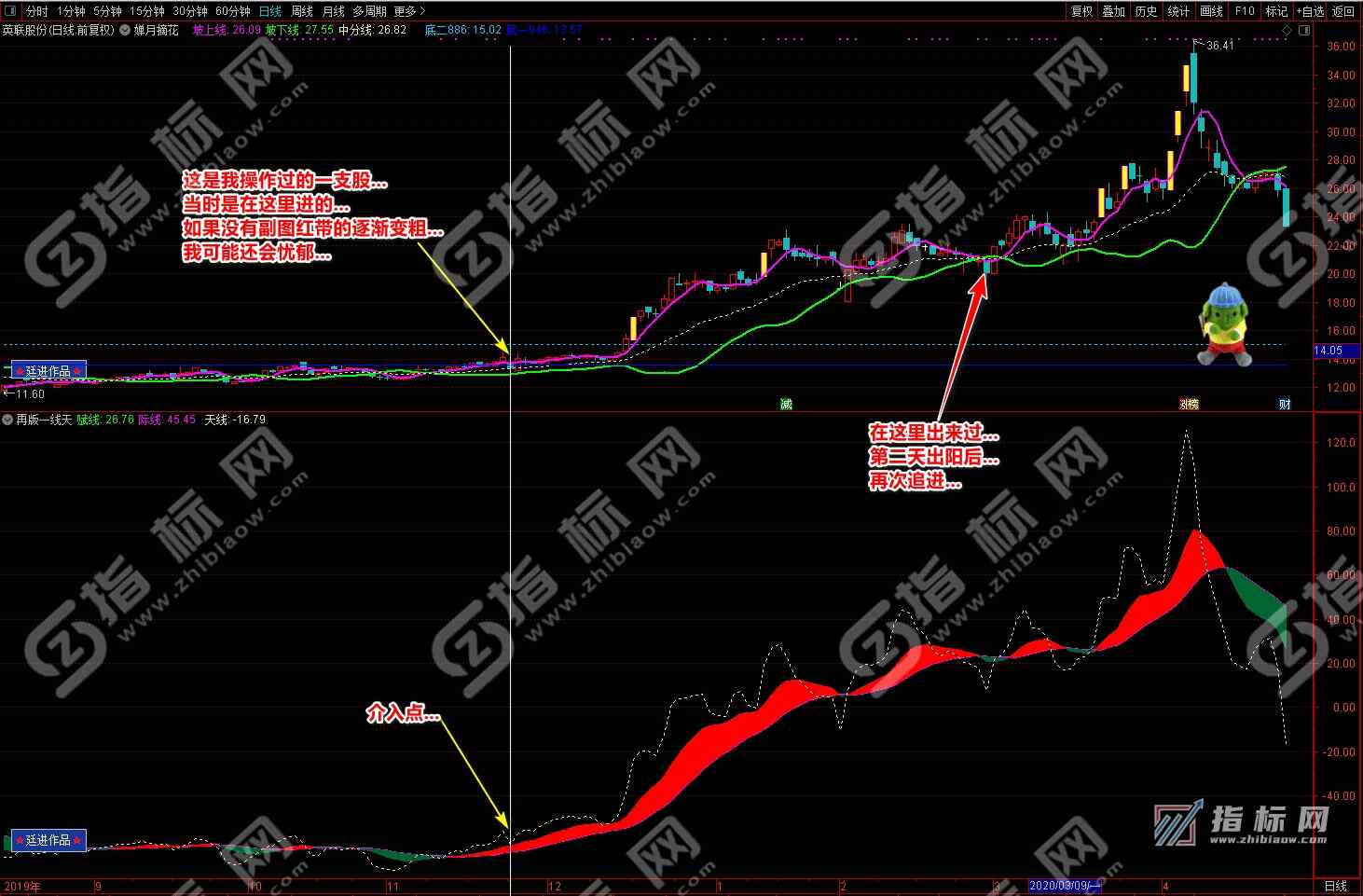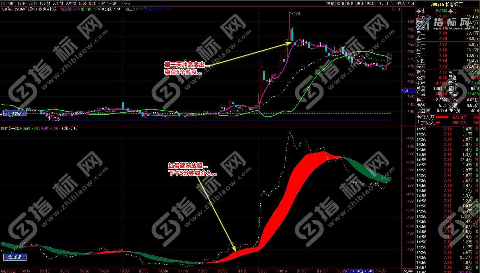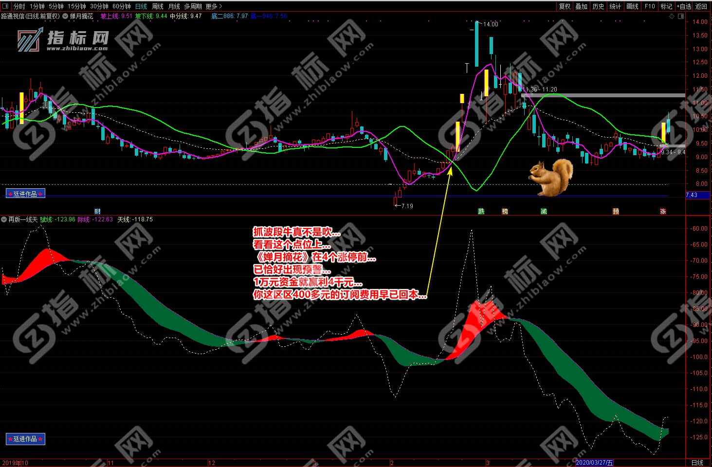 3.买点:婵月摘花主图中紫色的坡上线上穿绿色的坡下线形成金叉与再版一线天副图中黄色的天线上穿波段流(绿波段或红波段)形成共振信号,择机买入;