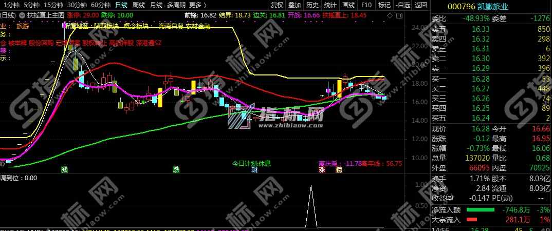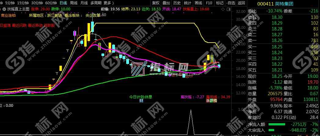 - 扶摇直上九万里主图指标有扶摇直上线(红色粗线)、结界线(黄色粗线)、跌停线(绿色粗线)、开占线(粉色粗线)以及黄色的涨停K线组成。