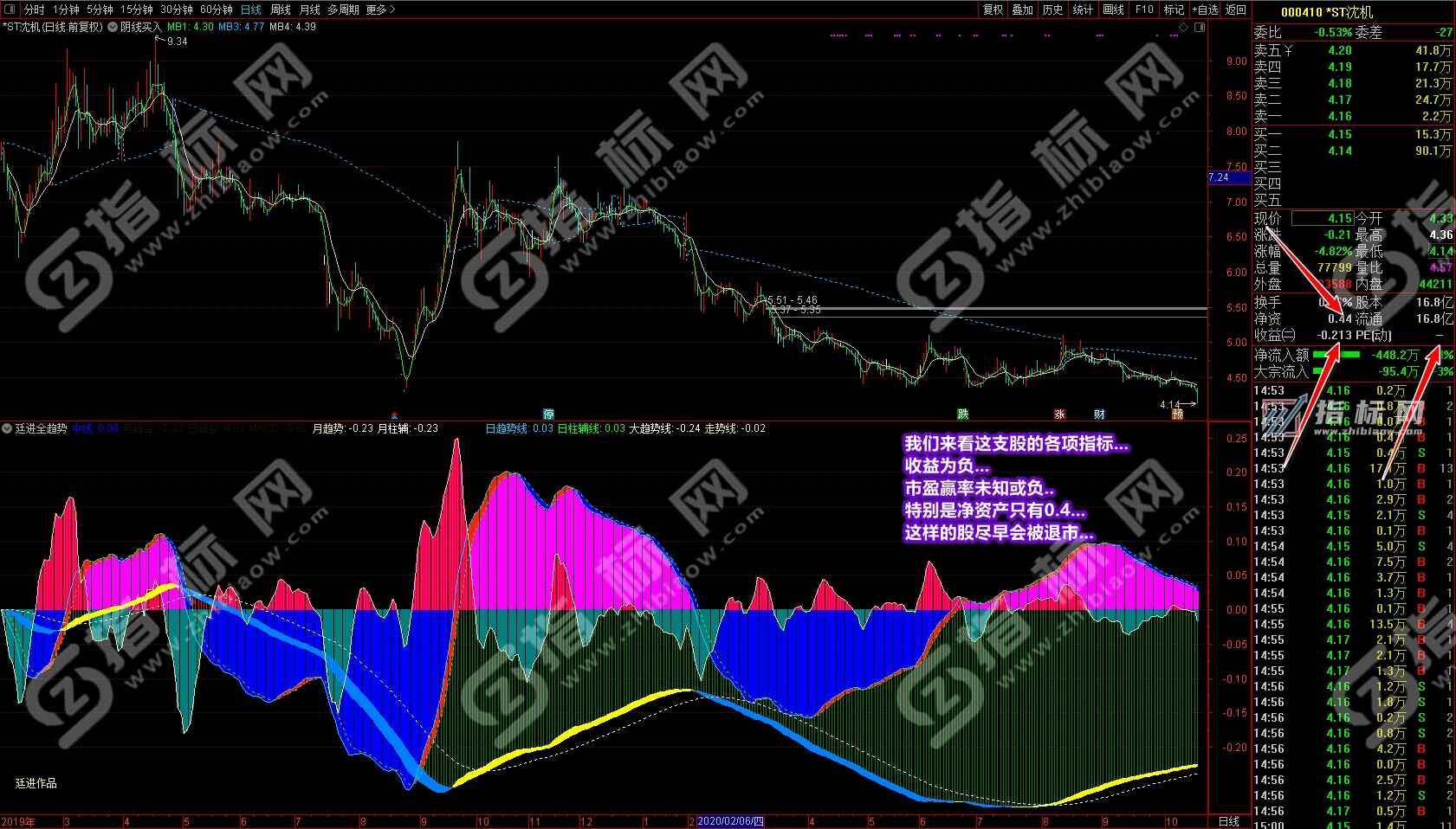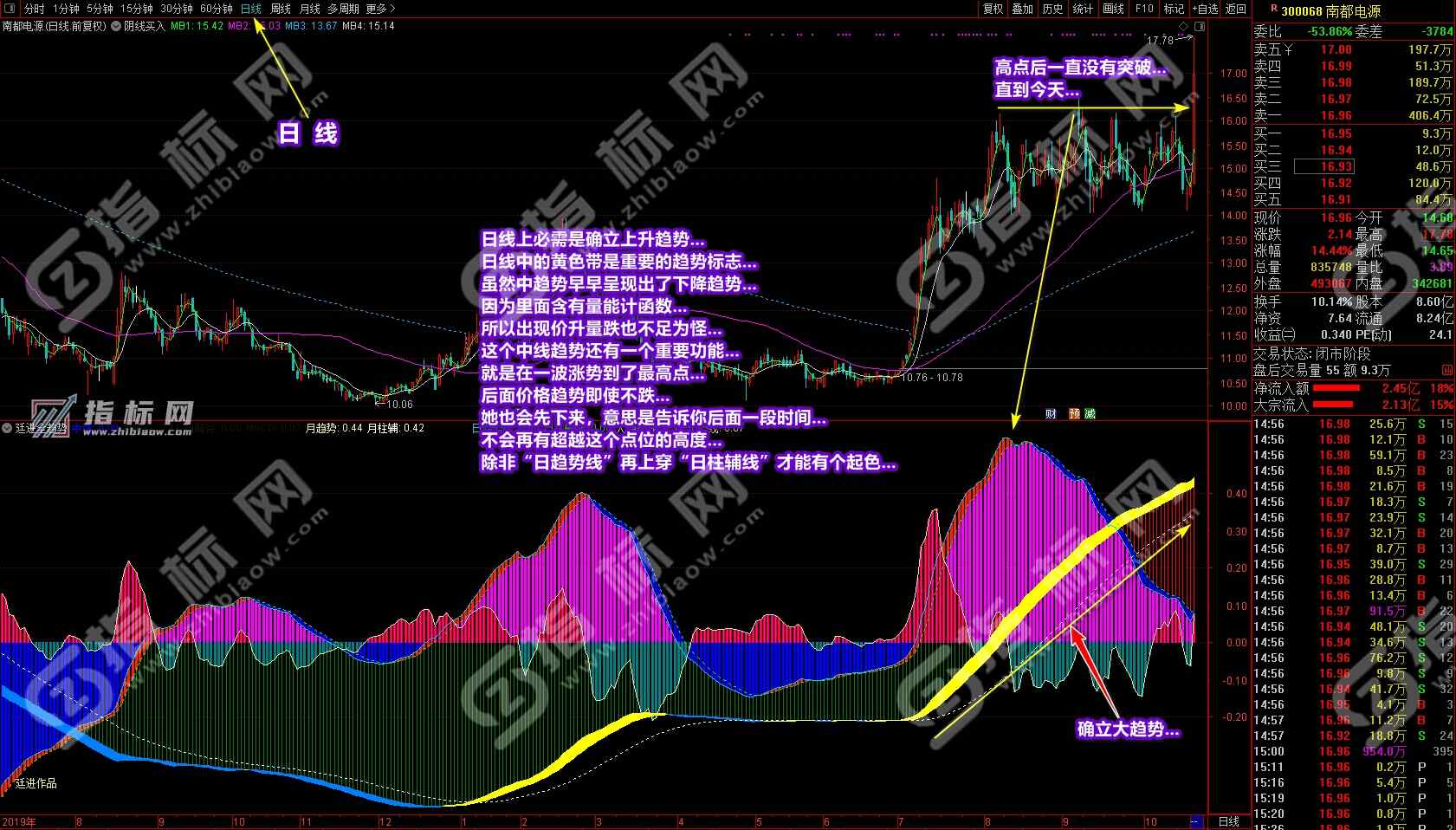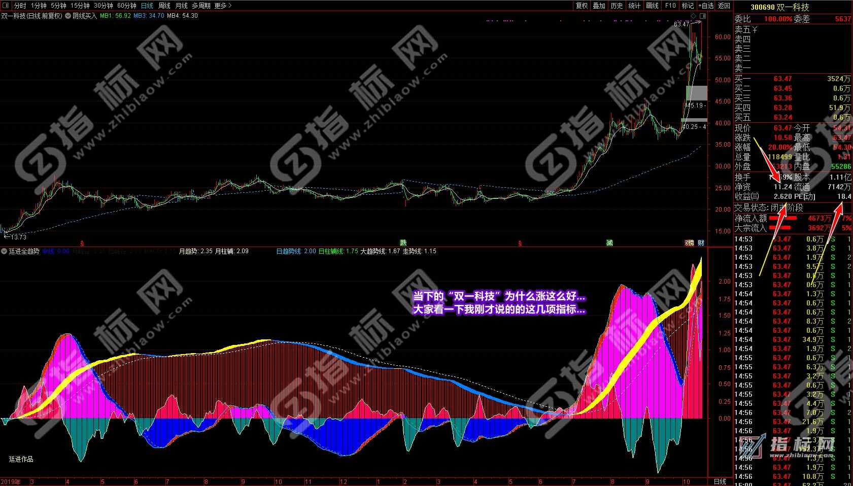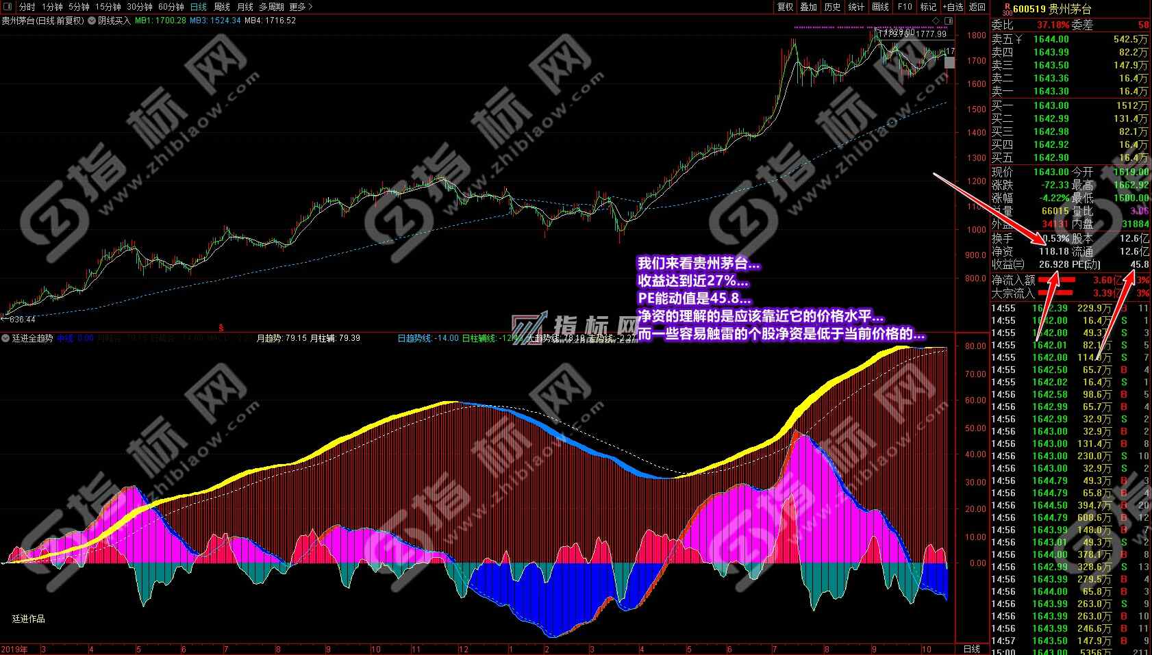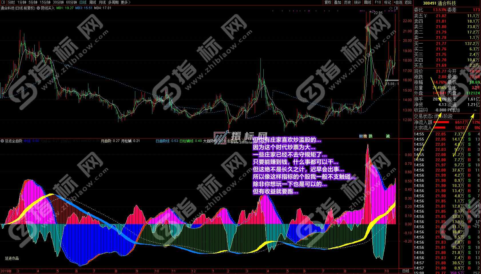 以前我经常和同学提到过;一个操作股票的散户要具备一定的盘觉,可能一些同学总是不知道盘感是什么或找不到盘感,这指标完全可以让你一个不懂盘感的人一眼看出个股当前的趋势和盘感来,让你明确知道哪支个股目前在涨,哪支个股目前在跌。很多同学吃亏就吃在看不清趋势上。究其原因是普通指标只会让你忐忑不安地看到几天或未知的趋势,特别是吃过亏的同学通过手里有的或高价订购的所谓“秘笈”指标也从不敢下重仓投入,在时间和资金的赢利上受到制约,所以想大幅赢利是非常困难的。为什么我说在媳妇从20亏损到8万多时我接手在这些年的时间可以扳回本呢?就是因为我一波接一波的只做大趋势,这一波做完接下来做其它个股的下一波,可以说天天有牛市。当初入市A股时也有2500多只个股了,可以说数量也不少了,在2500多只股票中可以说也是牛股不断。