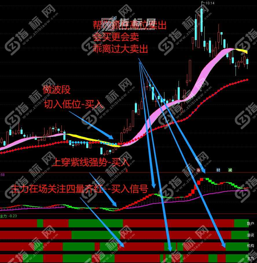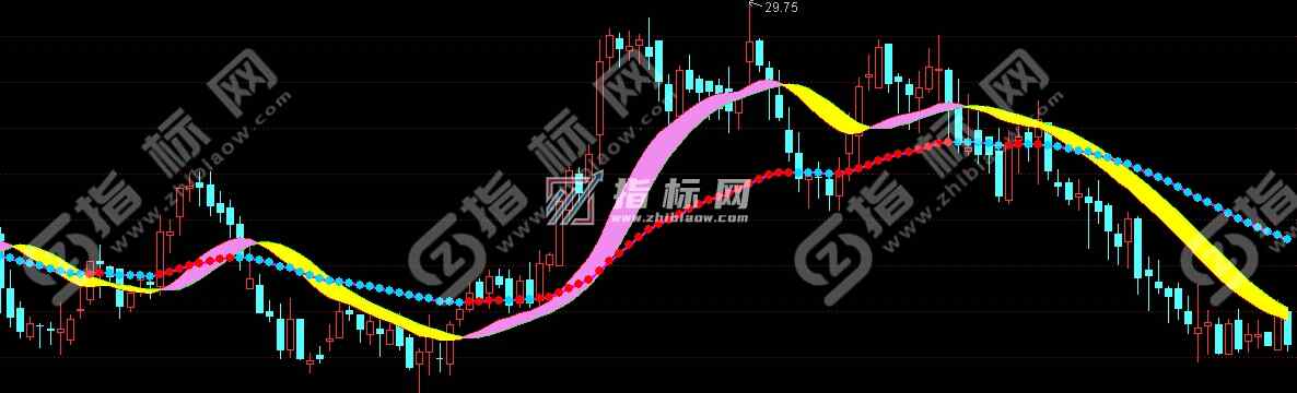 4、黄线或者紫线越宽表面力度越大、如黄变紫宽度加大说明上升趋势力度在加大