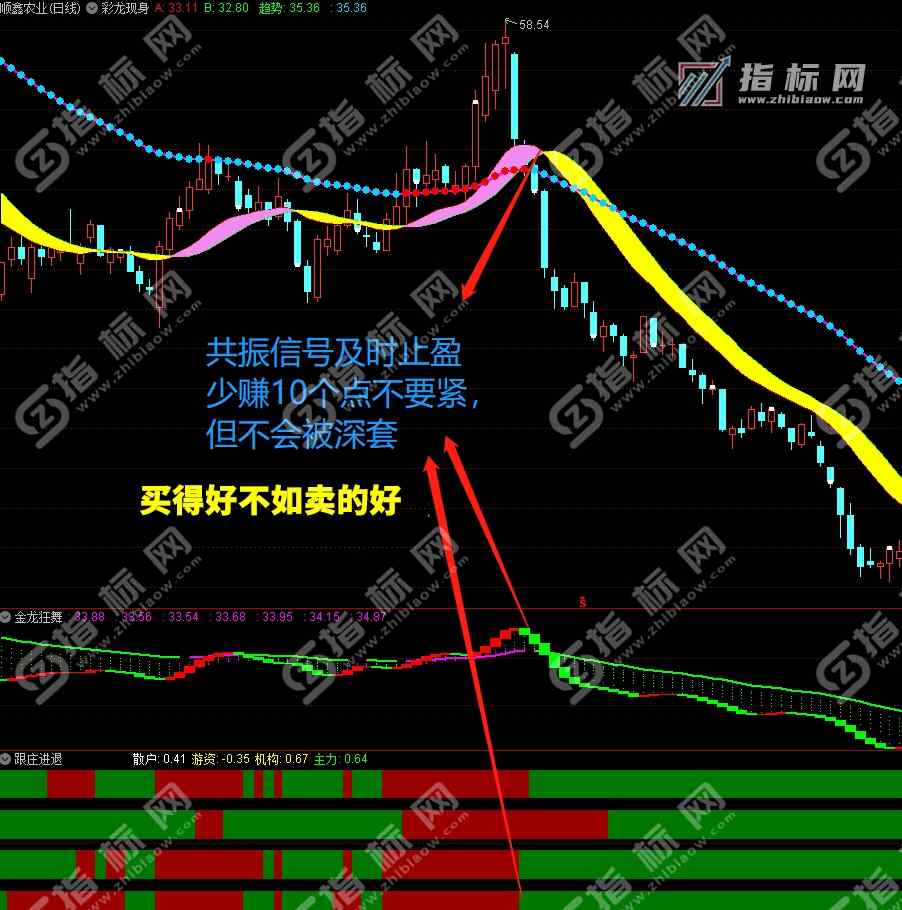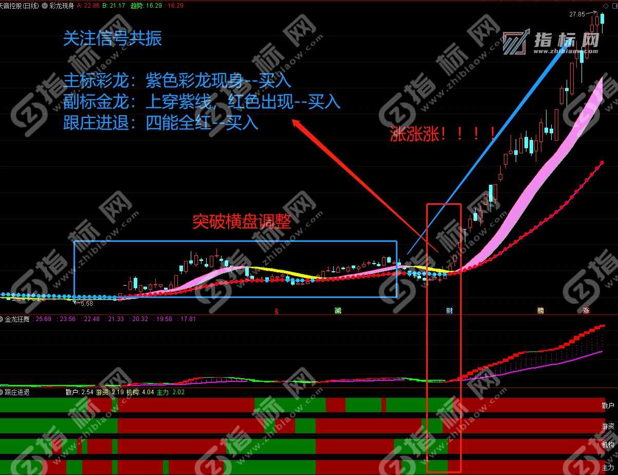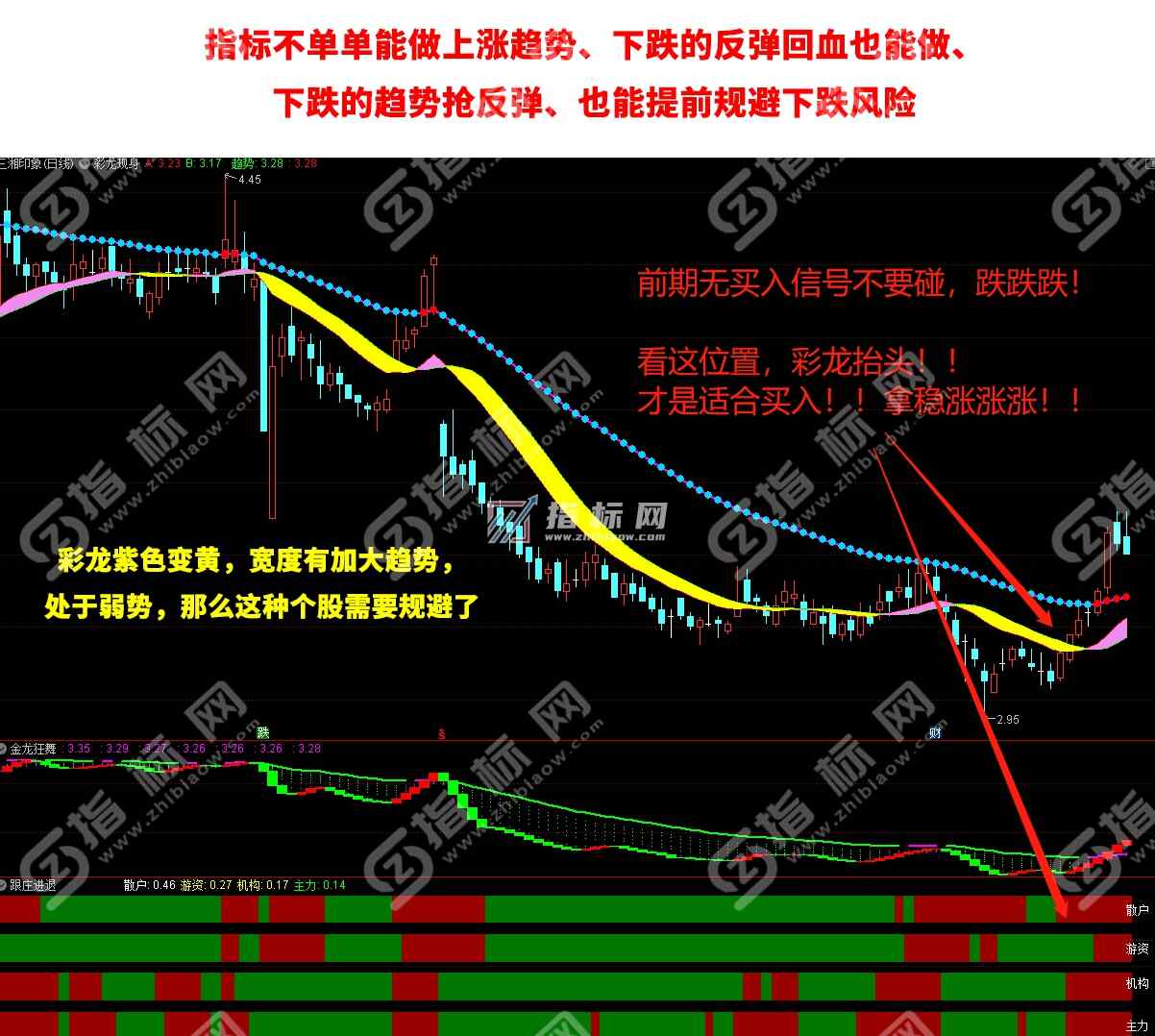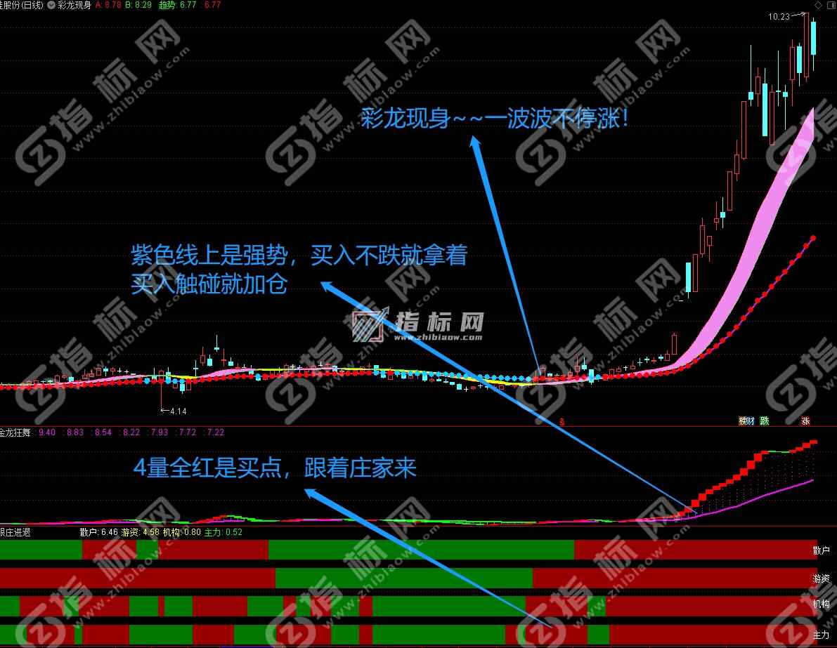 以下是通达信彩虹战法彩龙现身主图跟庄进退+金龙狂舞副图指标公式源码,包括一个彩虹战法主图彩龙现身指标、机构进退(跟庄进退)副图指标和一个彩龙狂舞(金龙狂舞)副图指标组成。本套指标可以上涨行成中上车,下跌行情中自救;手机版源码上传到到附件中,请自行下载。