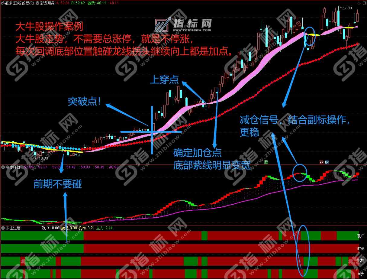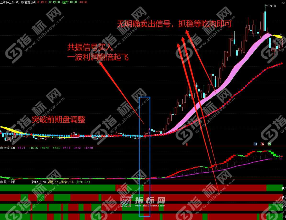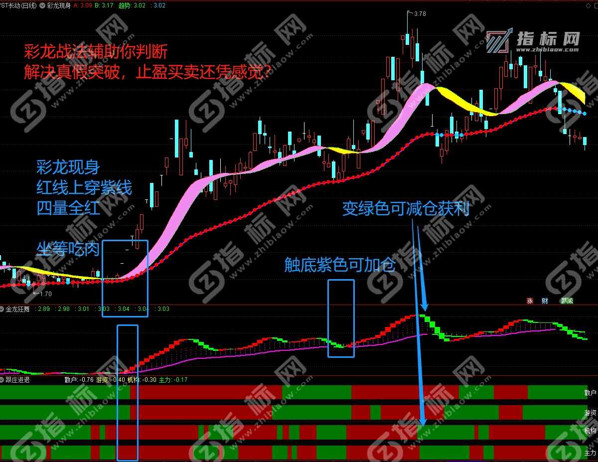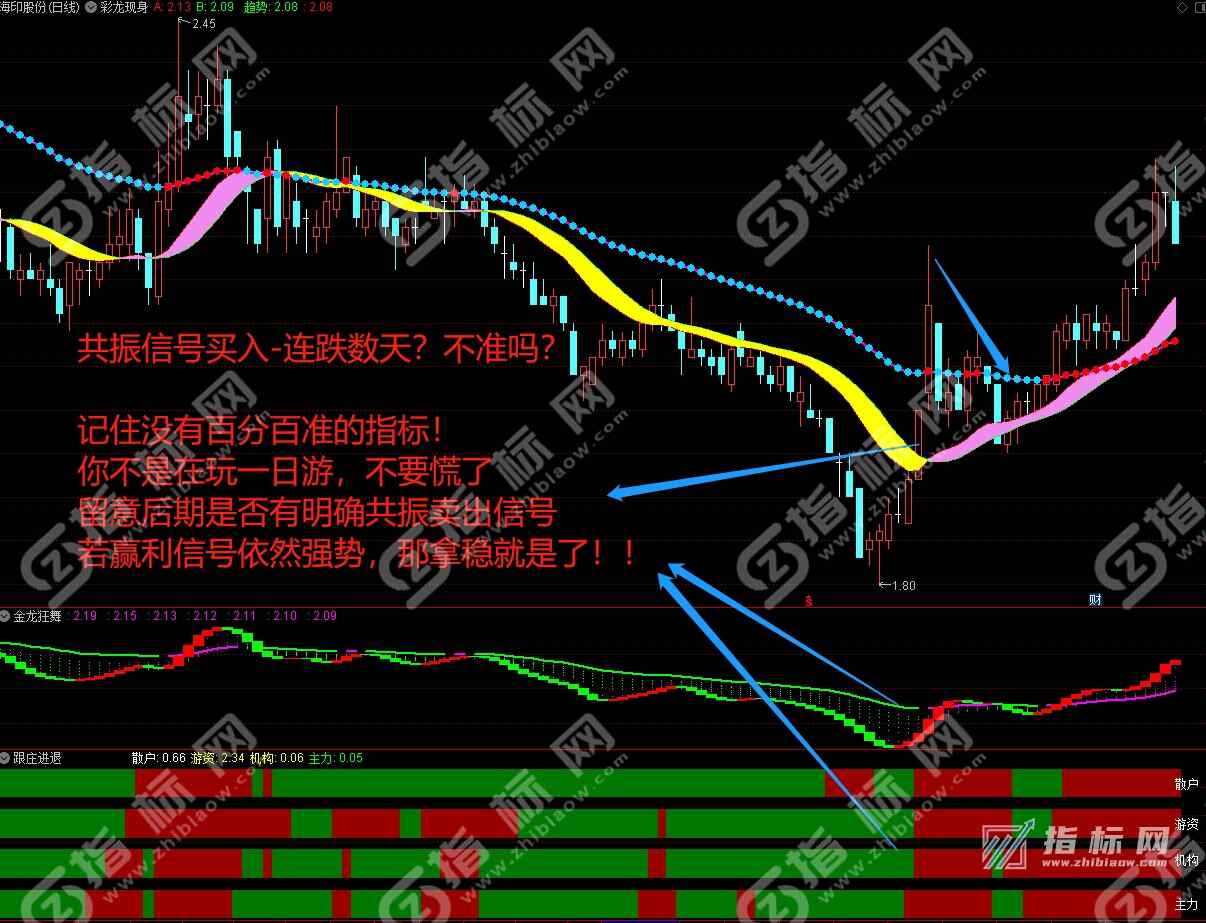 以下是通达信彩虹战法彩龙现身主图跟庄进退+金龙狂舞副图指标公式源码,包括一个彩虹战法主图彩龙现身指标、机构进退(跟庄进退)副图指标和一个彩龙狂舞(金龙狂舞)副图指标组成。本套指标可以上涨行成中上车,下跌行情中自救;手机版源码上传到到附件中,请自行下载。