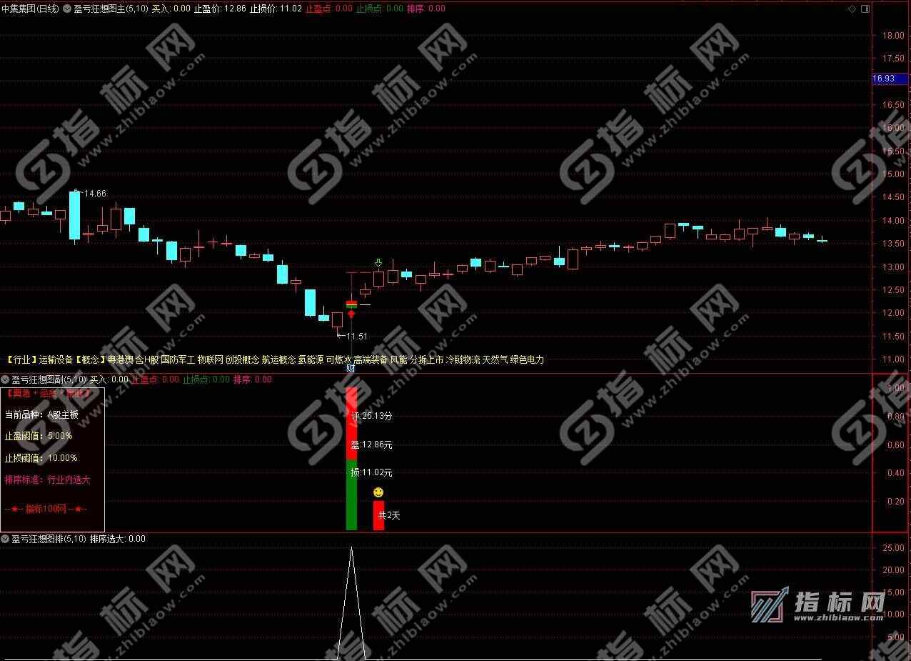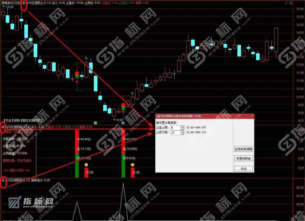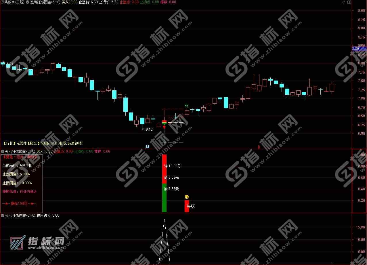 3、副图描述:左侧有当前品种提示,止盈和止损可以根据主板与创业板等涨幅不同,设置不同百分比。