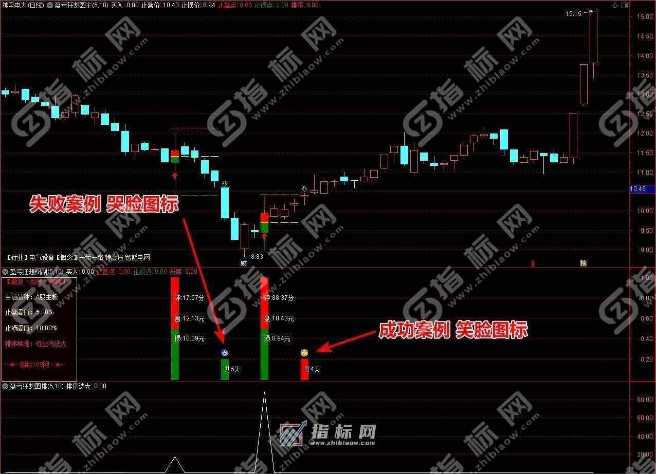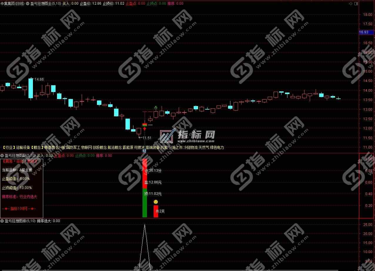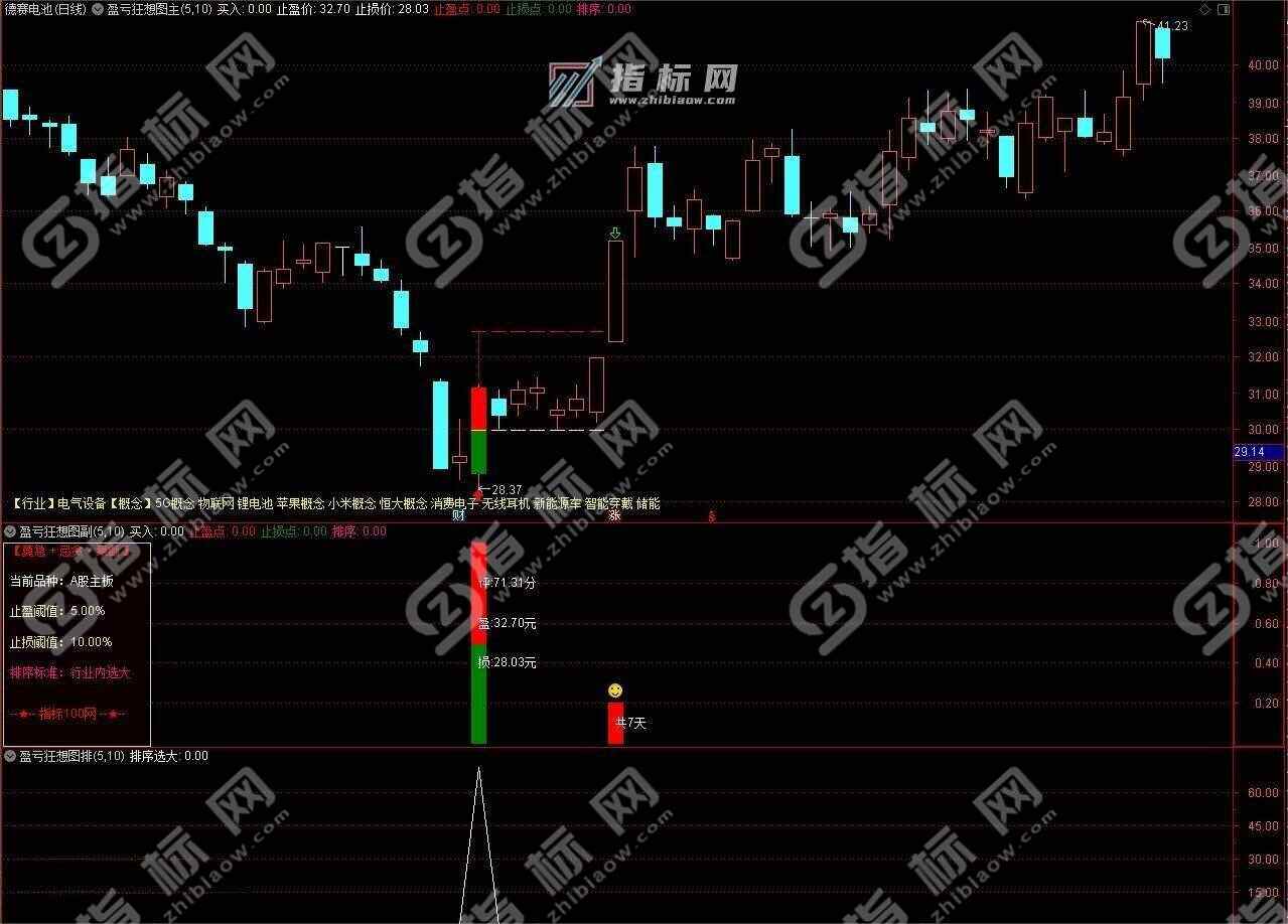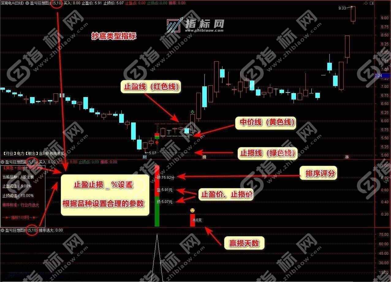 3、副图描述:左侧有当前品种提示,止盈和止损可以根据主板与创业板等涨幅不同,设置不同百分比。