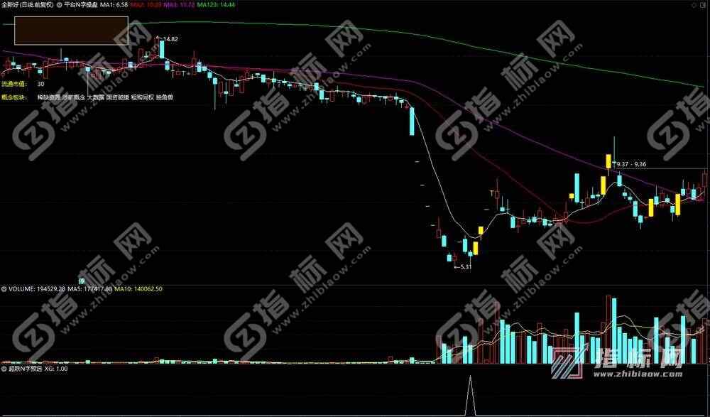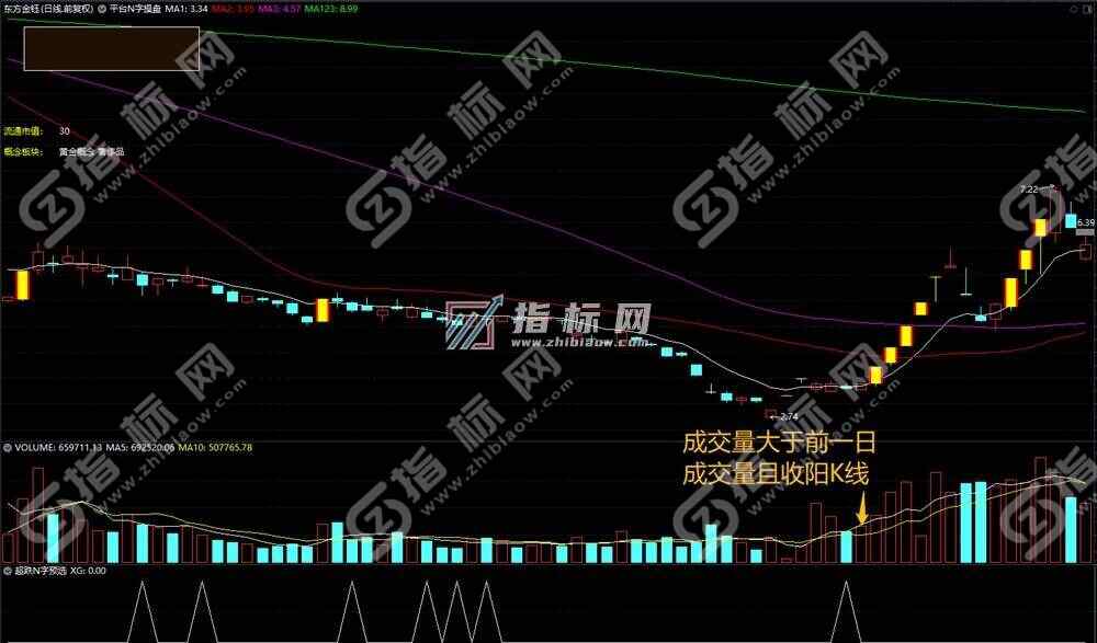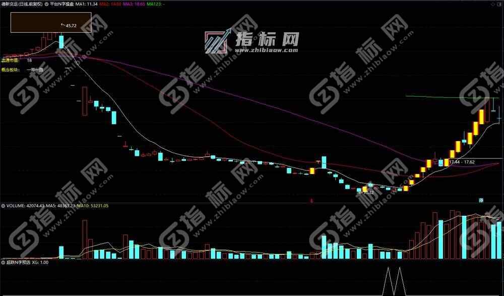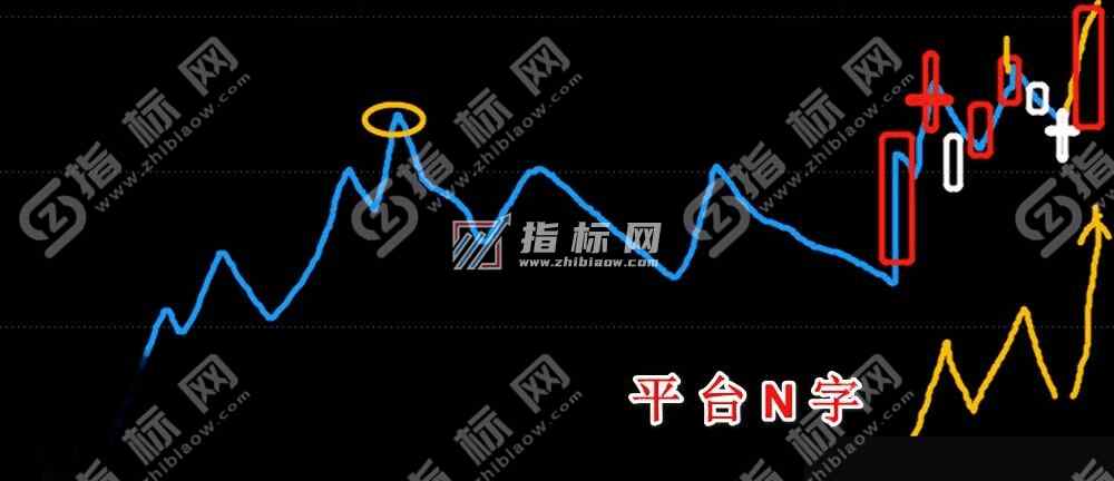 五、平台N字预选:适应环境:指数突破性行情,市场进入主升浪模式。涨停板后第二天冲高试探前期大平台附近,后续回调,形成M型的右脚。可选择13日线止跌处低吸,也可等反转阴线实体并参考30–60分钟周期一阳穿三线时买入,(有预选指标和启动指标)