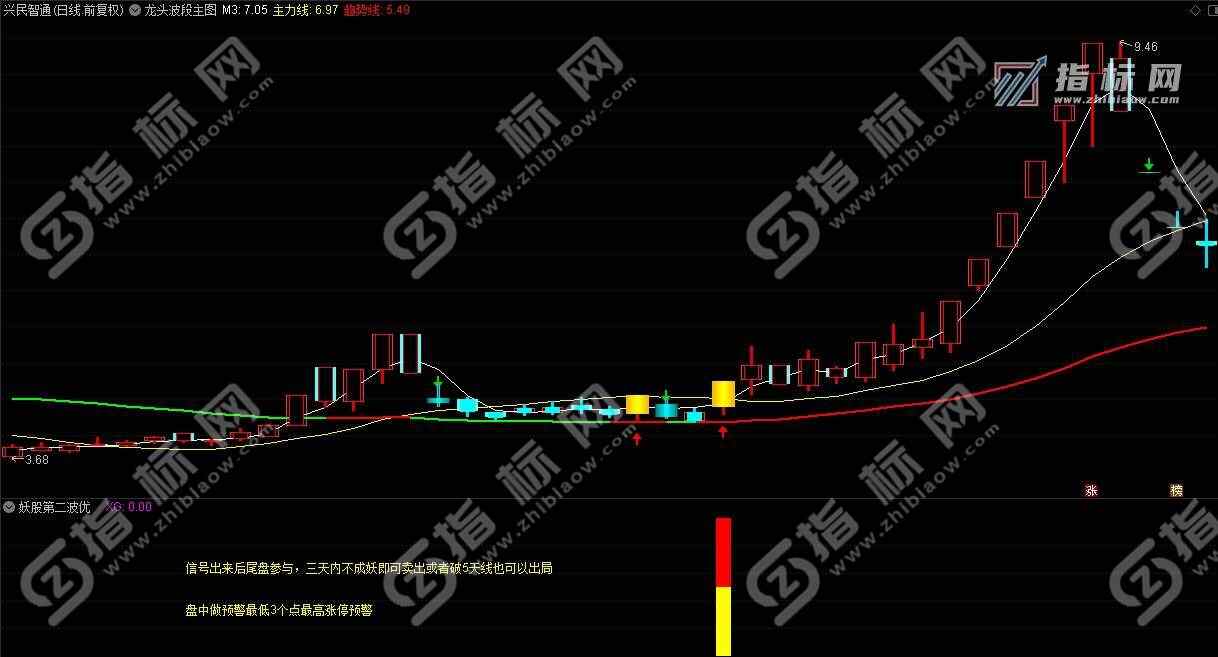 - 本指标使用于大妖股的第一波拉升后,经过一定幅度的下跌回调或一段时间的下跌回调后,主力再次启动的出击点。