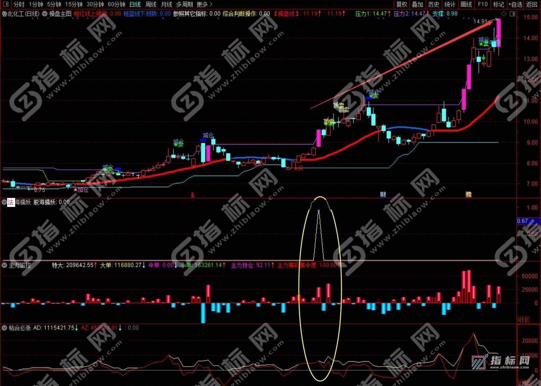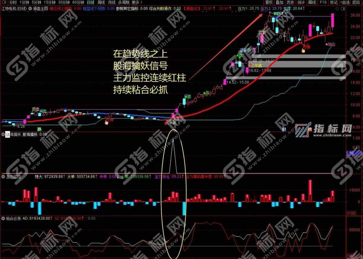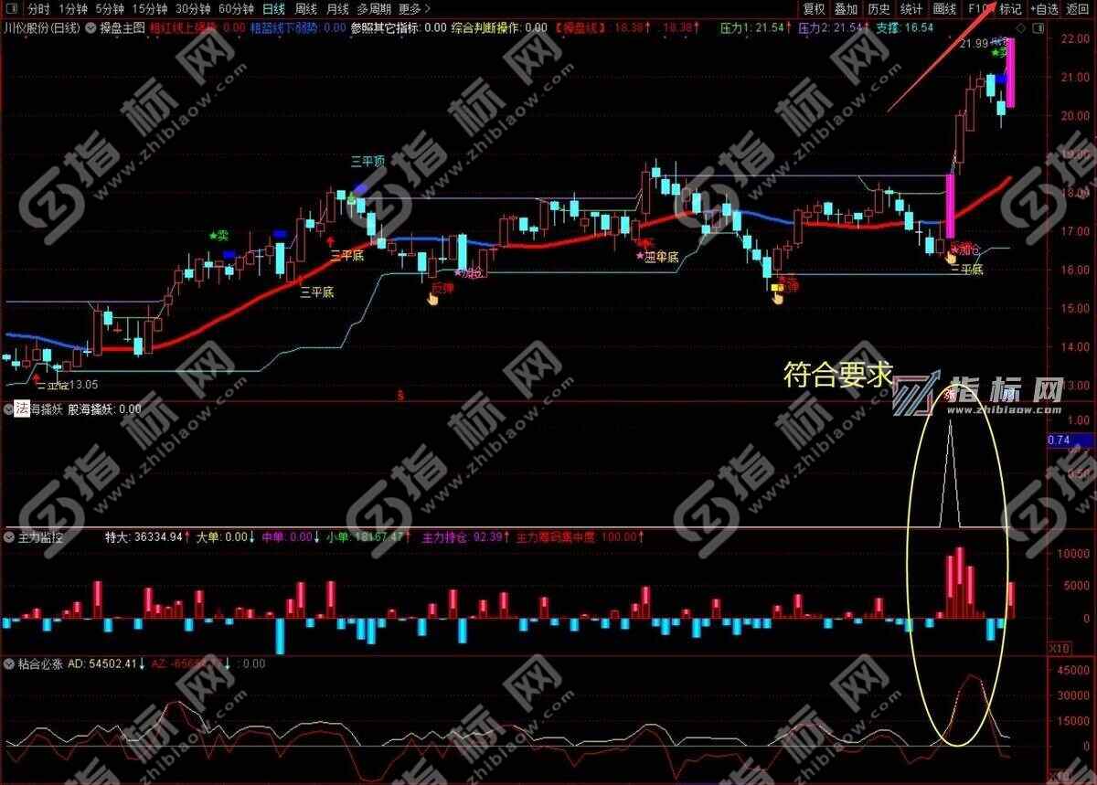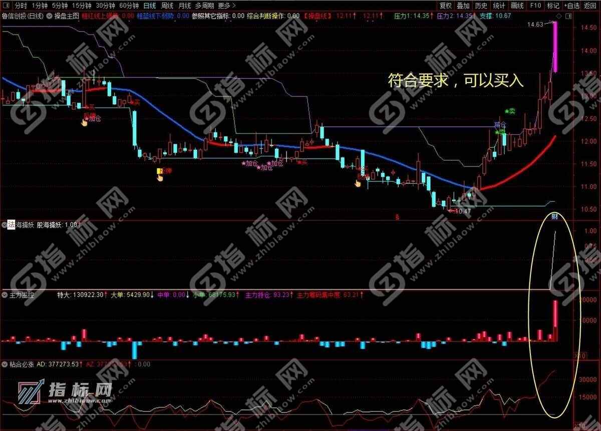 主图副图: 操盘主图 + 主力监控幅图 + 主力来了副图 + 粘合必涨幅图