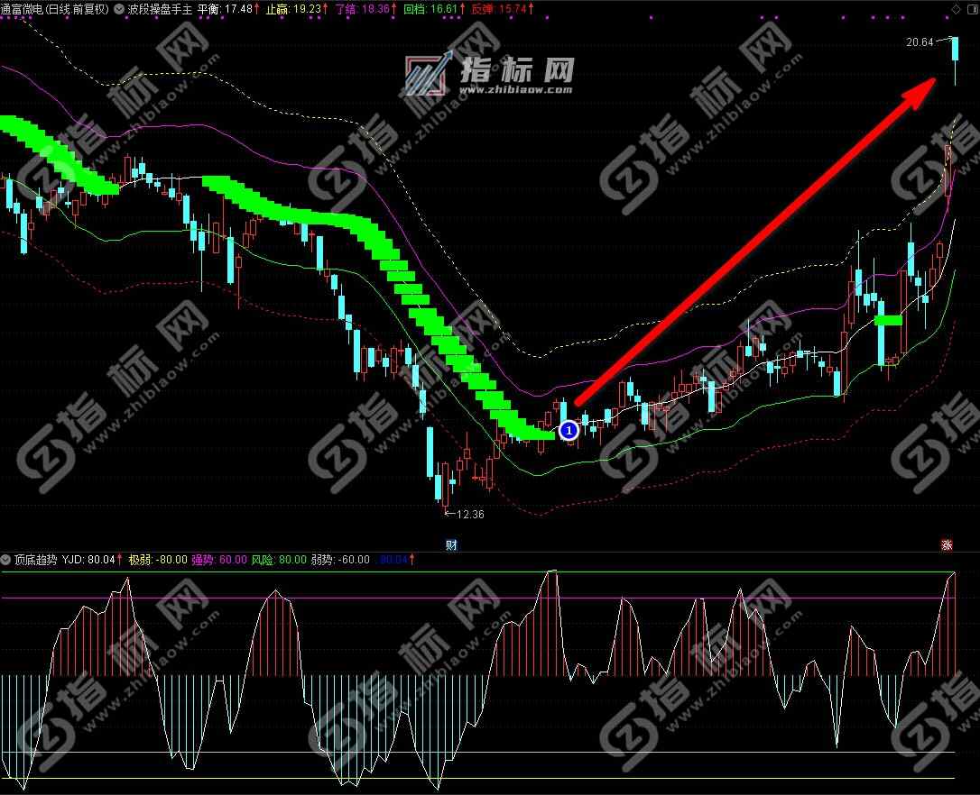 此指标为研判大盘和个股阶段性高点和低点的短线指标。当这一指标值达到最上部两条水平线(紫线和黄线) 时,短期回落的可能性极大;当它达到最底部两条水平线(绿线和蓝线)时,短期反弹的可能性极大。该指标通常与波段高手指标一同使用,效果极佳。