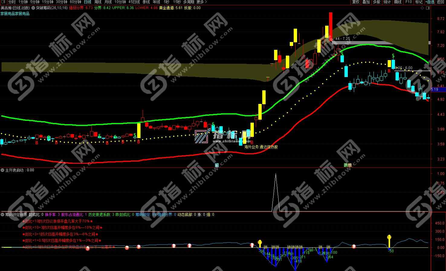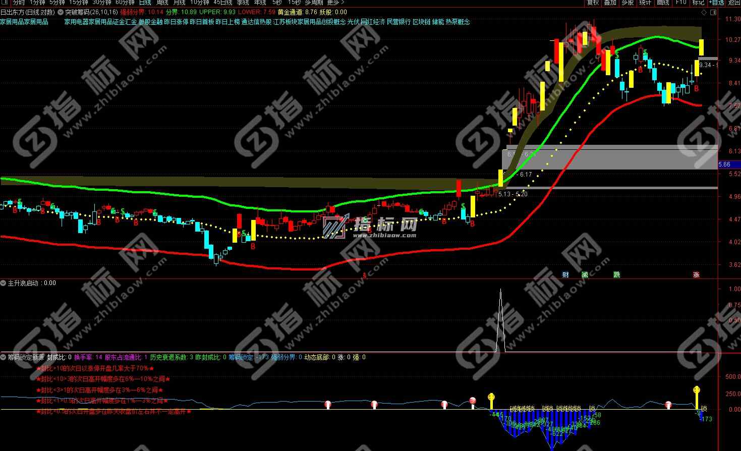 2、股价突破黄金通道上轨进入强势区,最好是涨停式突破,后续收获更大。