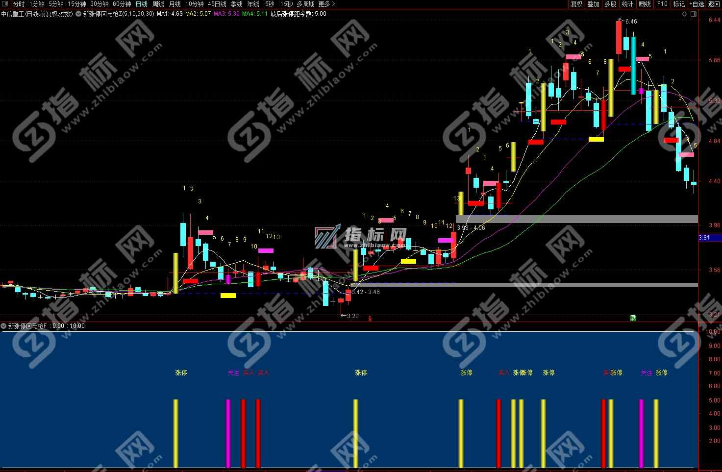 以下是通达信新涨停回马枪全套指标,包括一个主图指标、一个副图指标和两个选股公式。使用新版的涨停回马枪指标第一:要关注有涨停基因的股票;第二,注意涨停的位置(实盘中关注低位涨停没有大幅上涨的股票);第三:注意一定要选择上升趋势的股票,一浪上涨,二浪回调,三浪主升浪的回调买入时机;配合新涨停回马枪选股公式和副图指标的关注、买入信号提示进行操作;