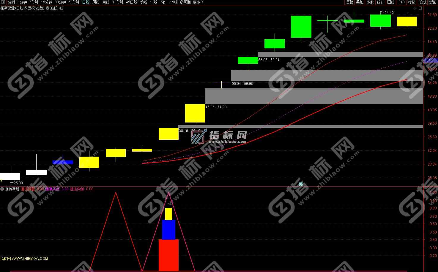 以下是通达信爆赚新股副图+选股指标公式截图和用法说明,爆赚新股指标专对新股开板后的操作指标,操盘中可配合波段K线主图指标公式的蓝色K线信号共振来验证信号的准确性。爆赚新股指标包括一个副图指标和四个选股公式指标。