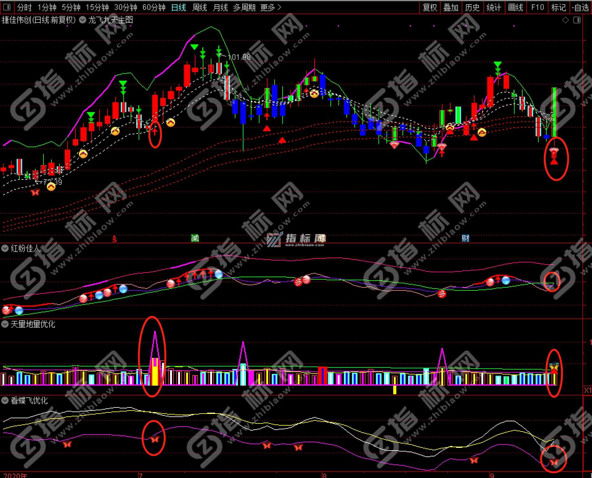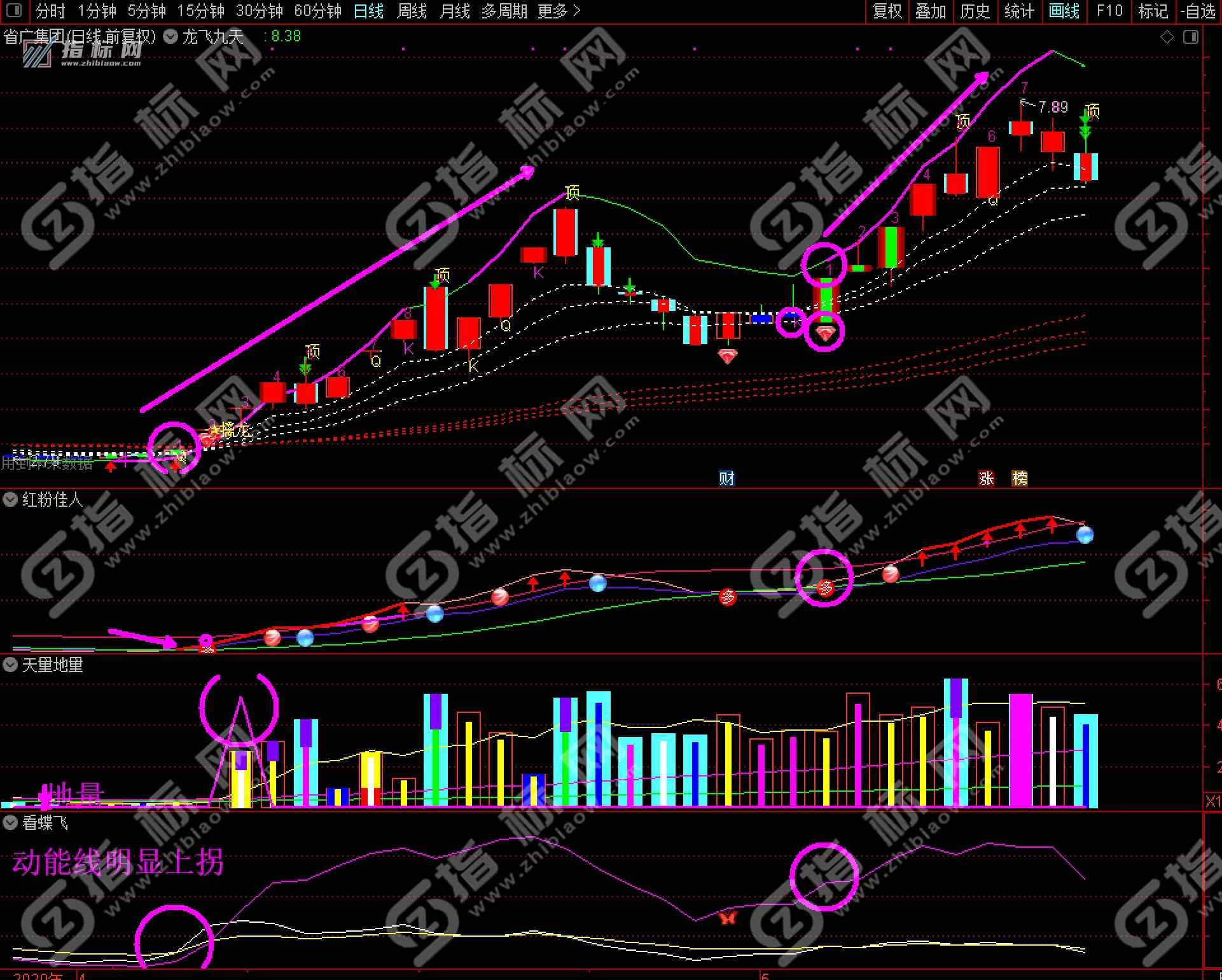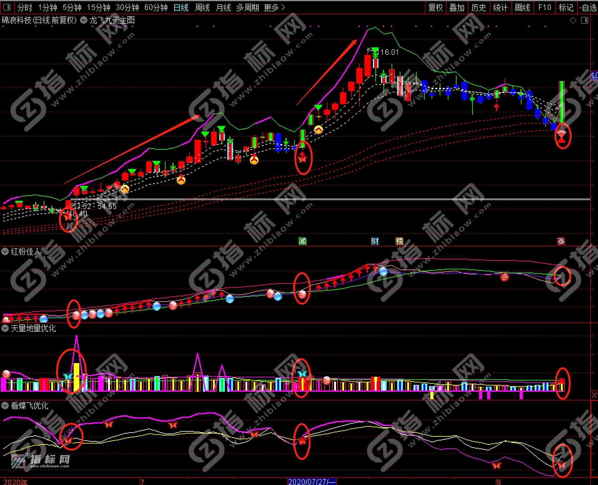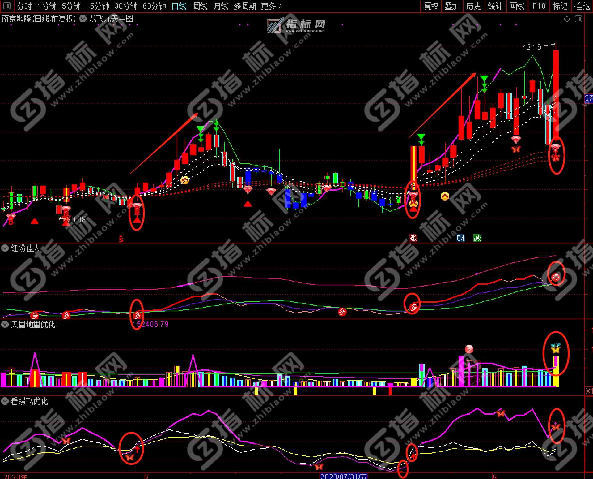 以下是通达信龙飞九天主图(红粉佳人+天量地量+看蝶飞)副图指标公式源码截图和用法说明,通达信龙飞九天组合指标有一个龙飞九天主图指标、一个粉红佳人副图指标、一个天量地量优化版的副图、一个看蝶飞的副图和一个选股公式组合而成,原指标已加密,指标网提供和谐版无加密版已上传至附件。