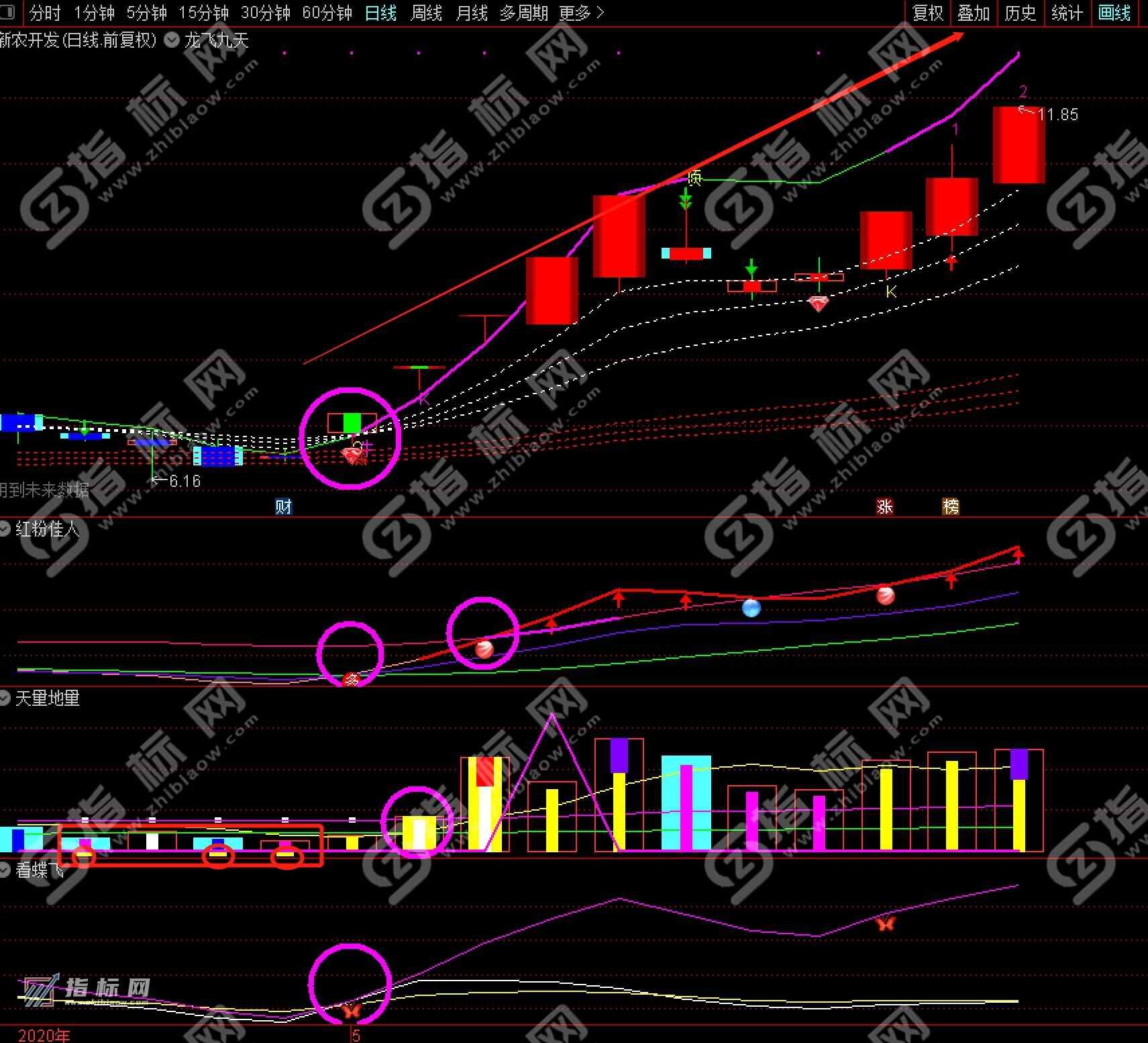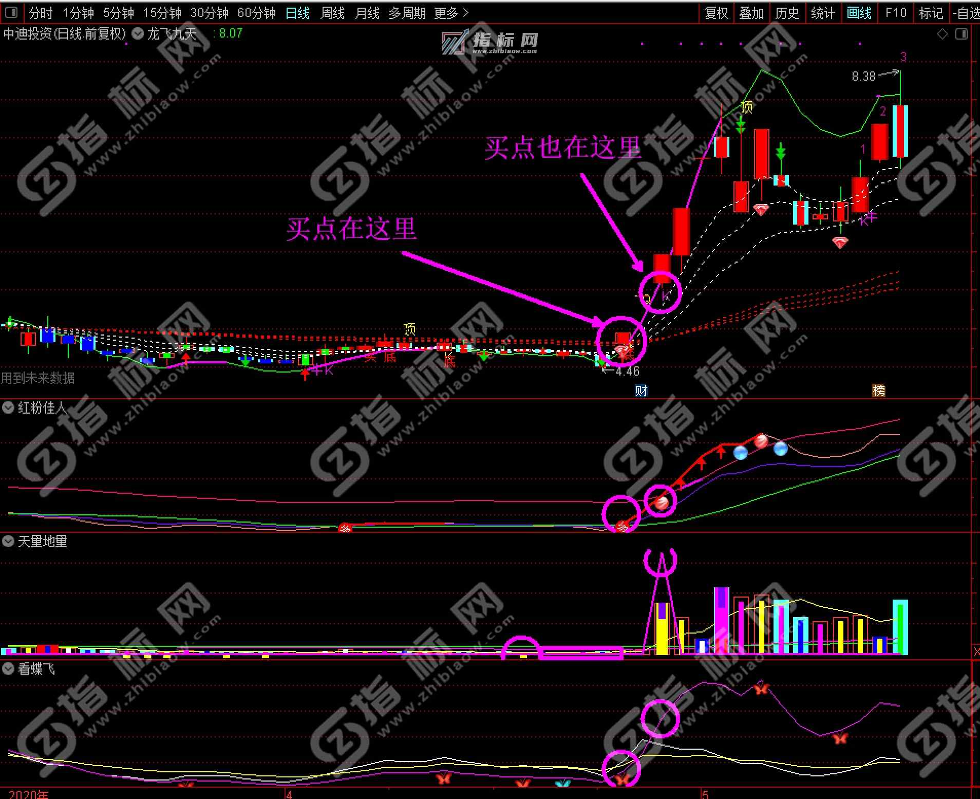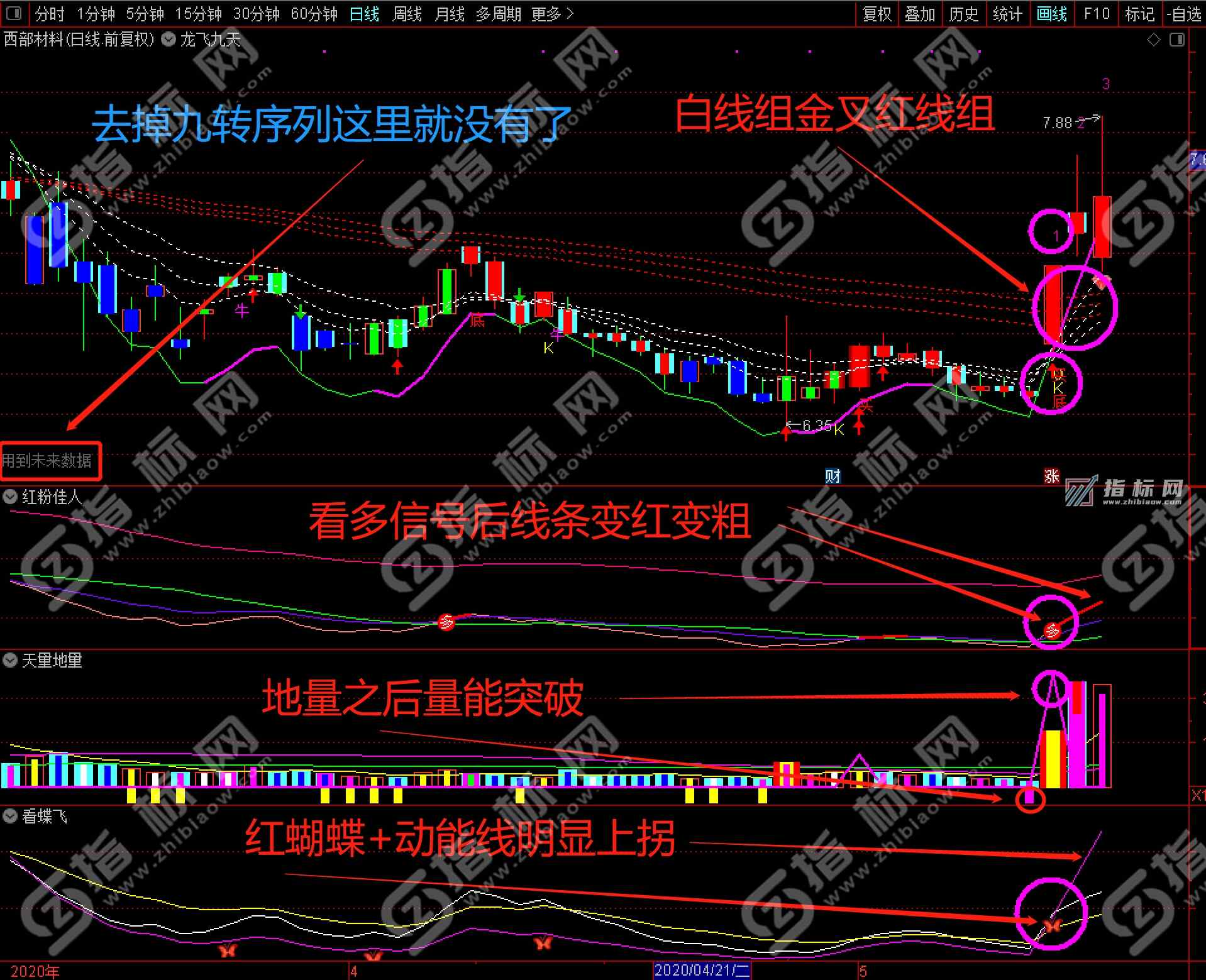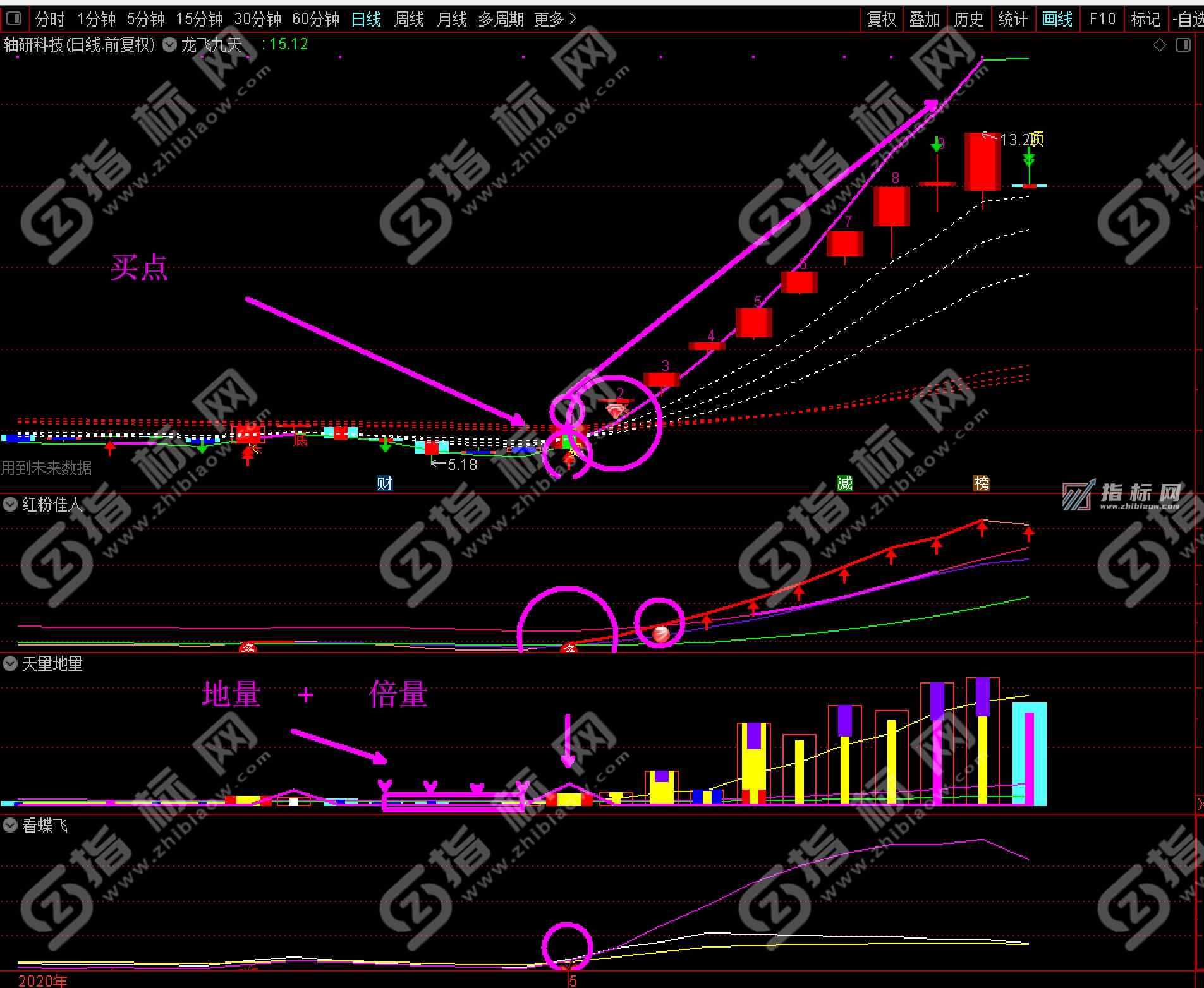 以下是通达信龙飞九天主图(红粉佳人+天量地量+看蝶飞)副图指标公式源码截图和用法说明,通达信龙飞九天组合指标有一个龙飞九天主图指标、一个粉红佳人副图指标、一个天量地量优化版的副图、一个看蝶飞的副图和一个选股公式组合而成,原指标已加密,指标网提供和谐版无加密版已上传至附件。