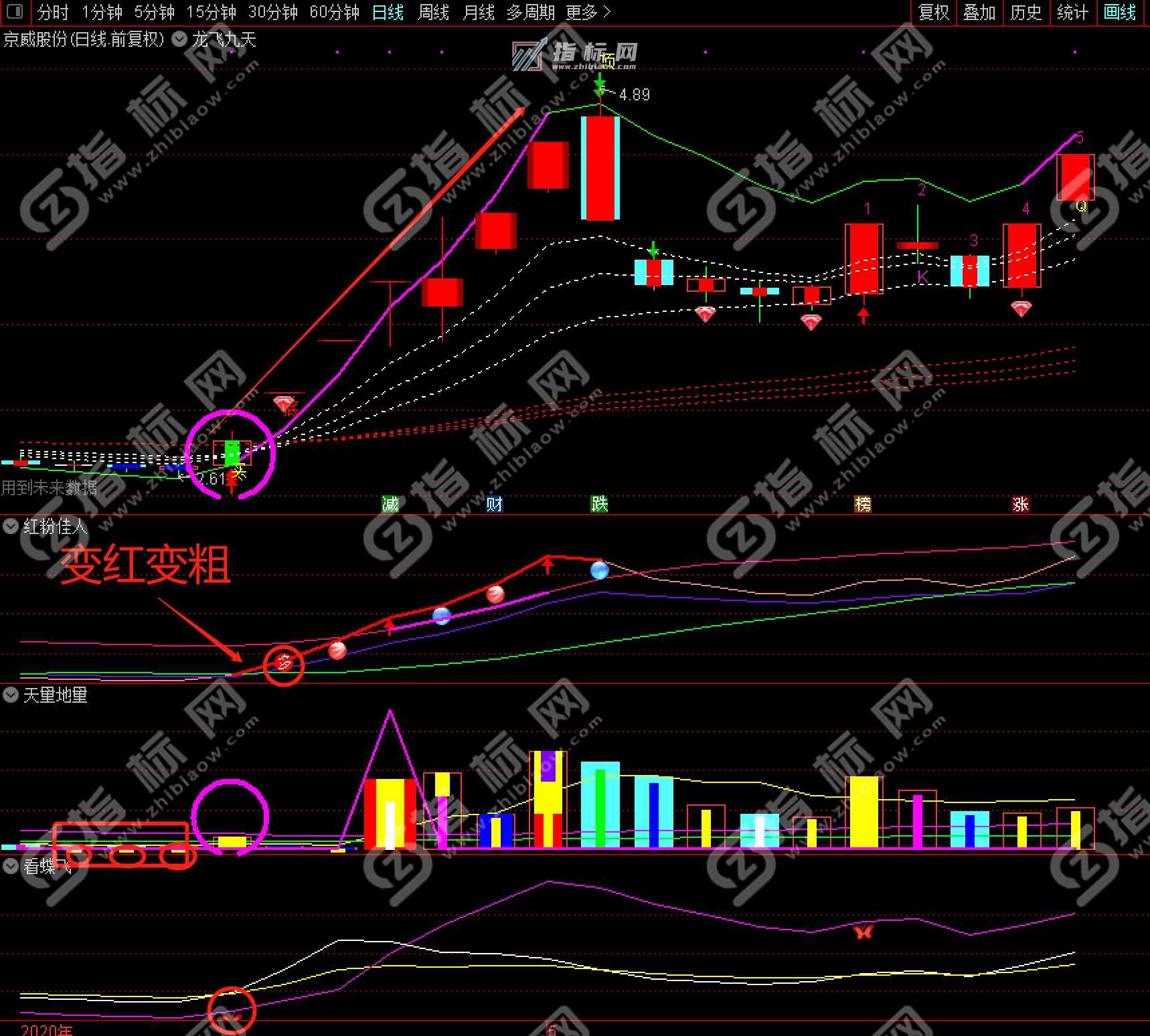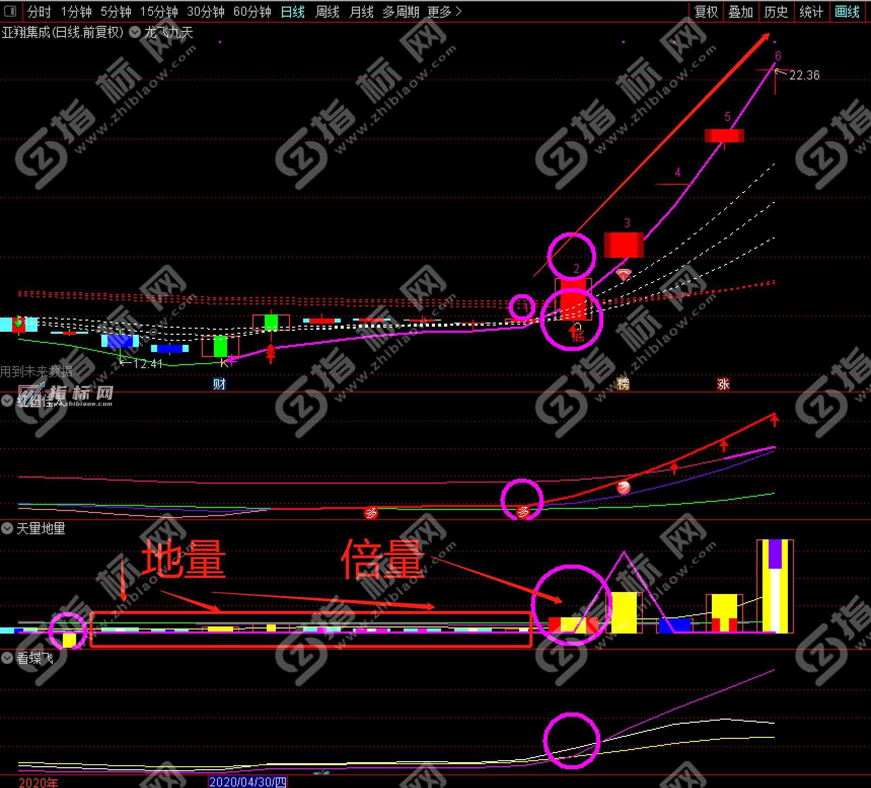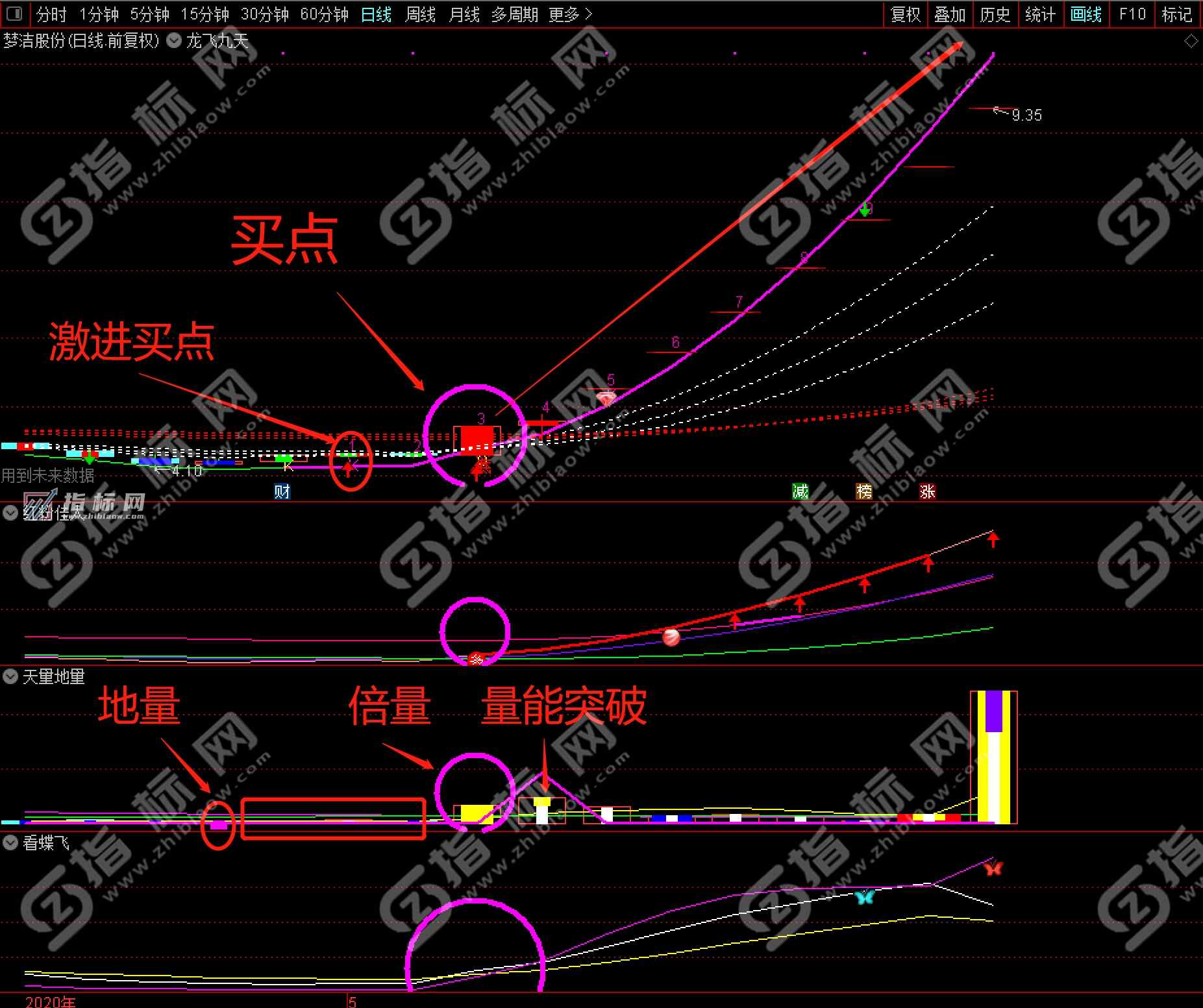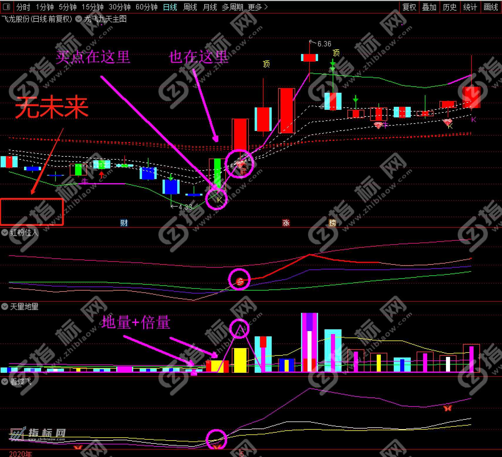 以下是通达信龙飞九天主图(红粉佳人+天量地量+看蝶飞)副图指标公式源码截图和用法说明,通达信龙飞九天组合指标有一个龙飞九天主图指标、一个粉红佳人副图指标、一个天量地量优化版的副图、一个看蝶飞的副图和一个选股公式组合而成,原指标已加密,指标网提供和谐版无加密版已上传至附件。