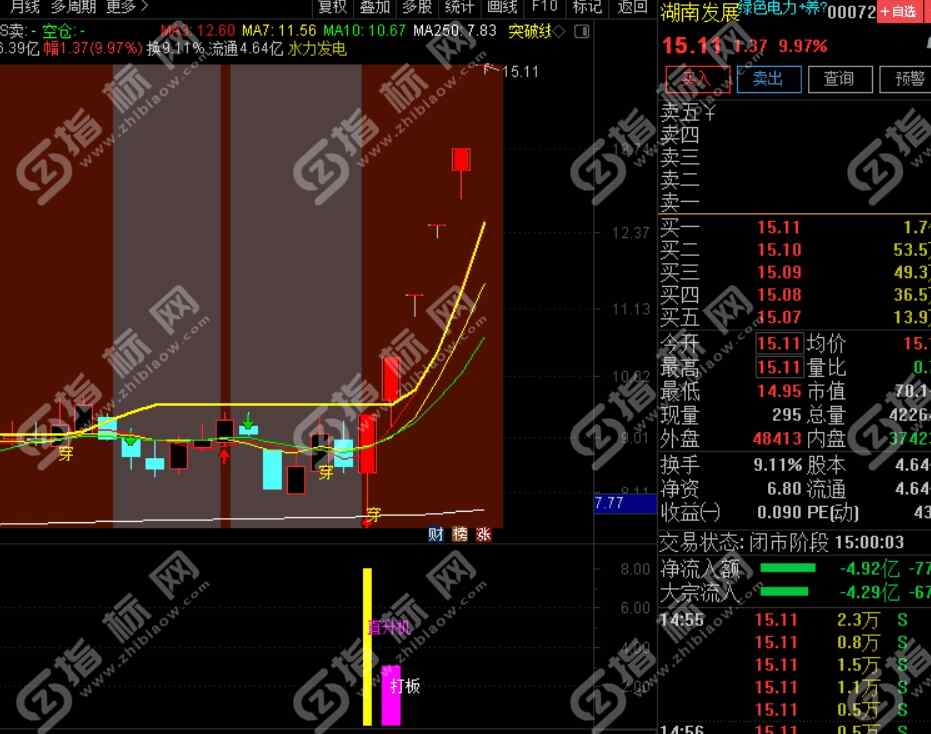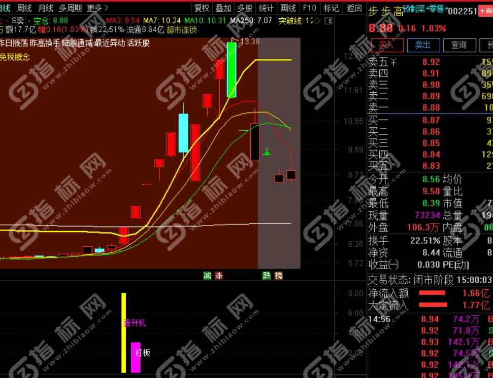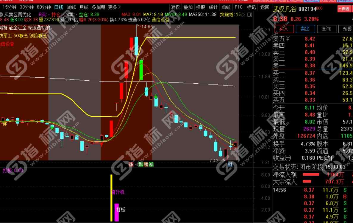 1.直升机副图信号黄色柱表示直升机信号、紫色柱表示反包打板信号、绿色三角表示低吸信号;