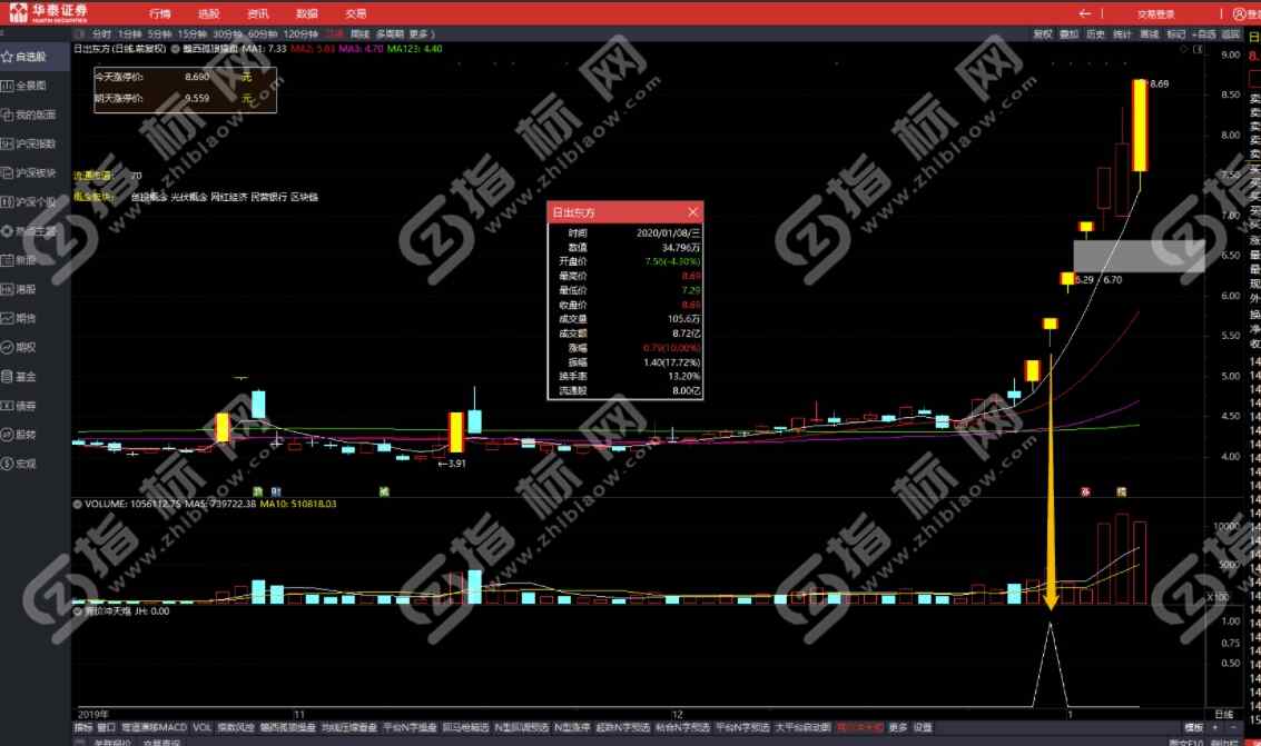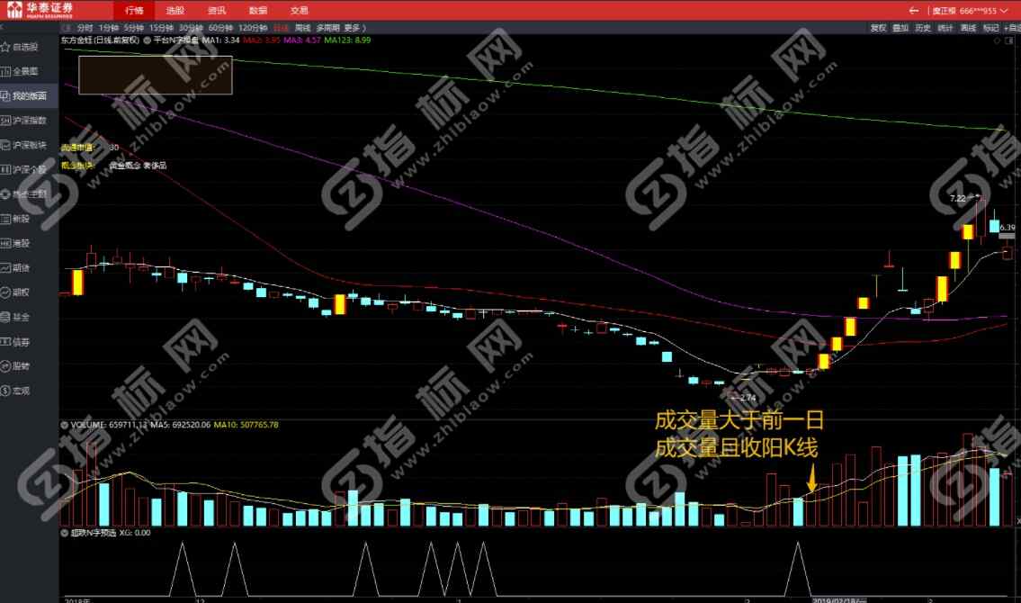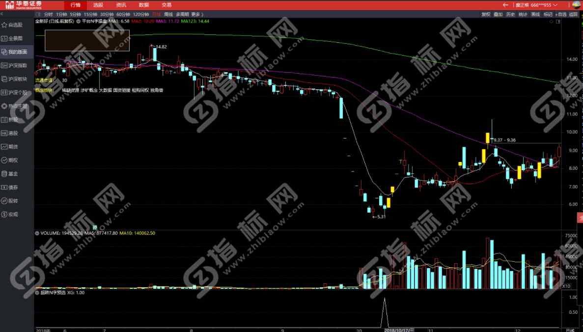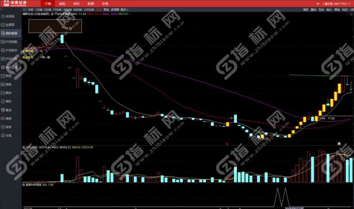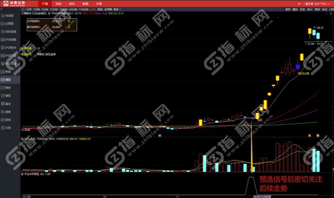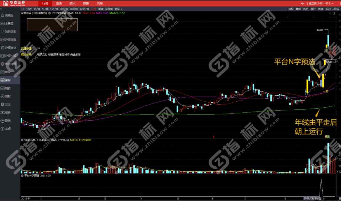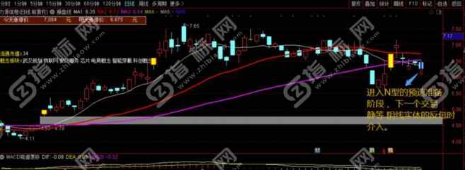 5.平台N字预选指标适用于指数突破性的行情,此时市场进入主升浪模式,在涨停板后的第二天冲高至前期大平台附近后回调,开成M型的右脚,当股价回调至13日均线附近时可进行低吸买入,或在早盘股价上涨至2.5%~4.5%之前时介入。