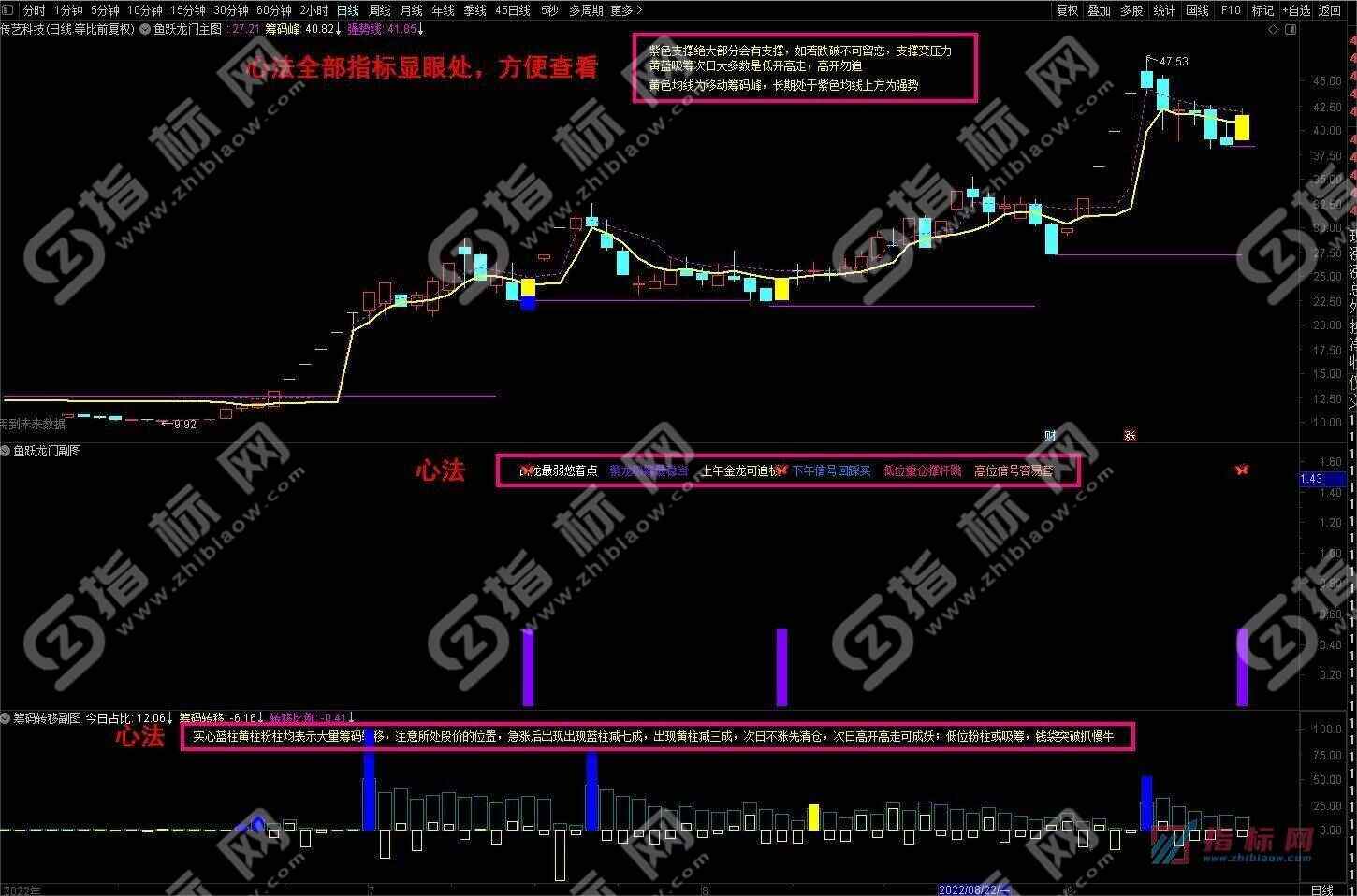通达信鱼跃龙门捉妖王指标根据筹码原理基础编写而成,是一套带有吸筹、出货信号提示,捕捉妖股第一个涨停板的完整的炒股利器。通过筹码原理自动对支撑和压力进行画线,清晰简洁明了。全套指标包含一个鱼跃龙门主图、一个鱼跃龙门副图、一个筹码转移副图和鱼跃龙门金龙选股、黄蓝吸筹选股、近期出现两次选股、白龙吸筹选股、紫龙选股公式全套指标共8个。实测全套指标除主图包含一个副图函数外其它指标均无未来函数,使用时请先更新盘后数据。