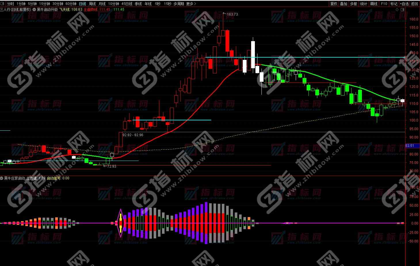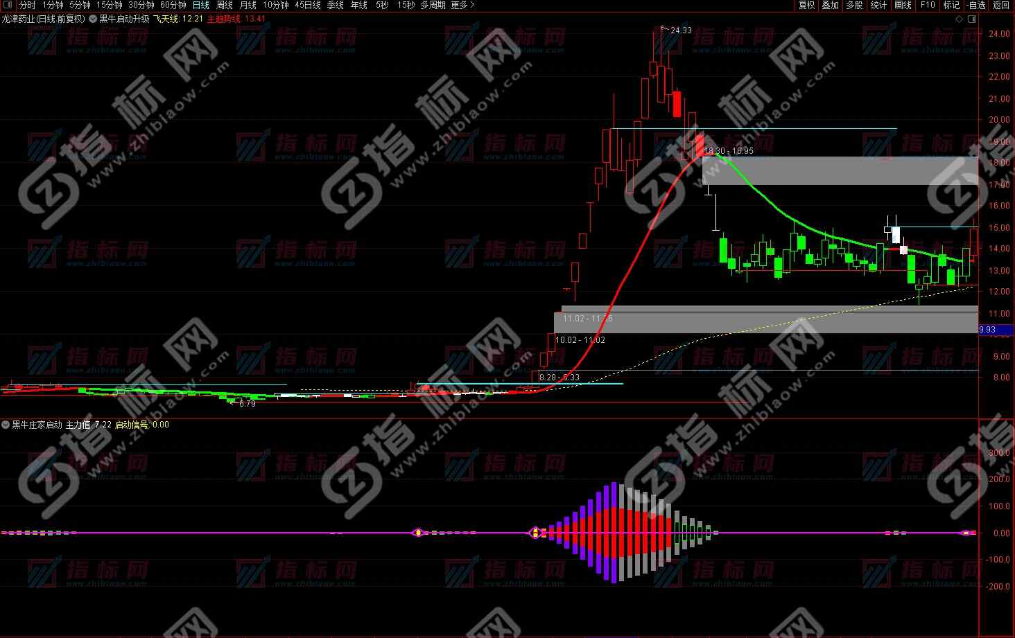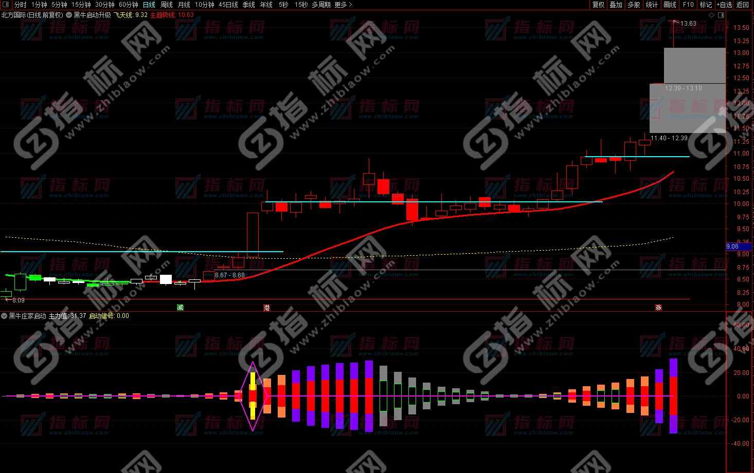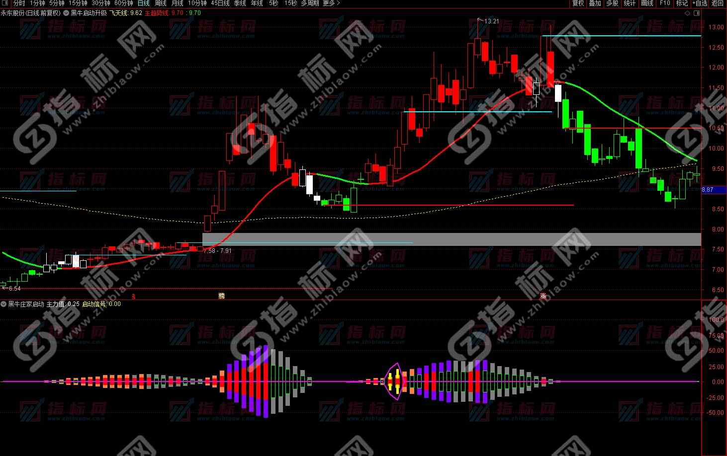 1.黑牛庄家启动指标一看就会用,出现庄入信号,表示启动,结合红、紫、绿、灰色柱持股;