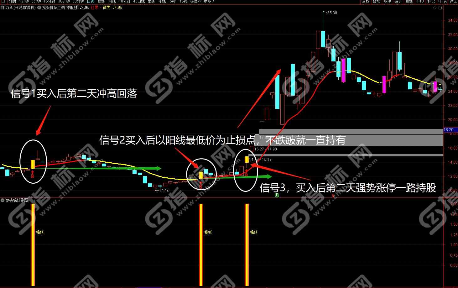 3.龙头擒妖副图出来提示擒妖信号对应主图的中的黄K线信号提示;