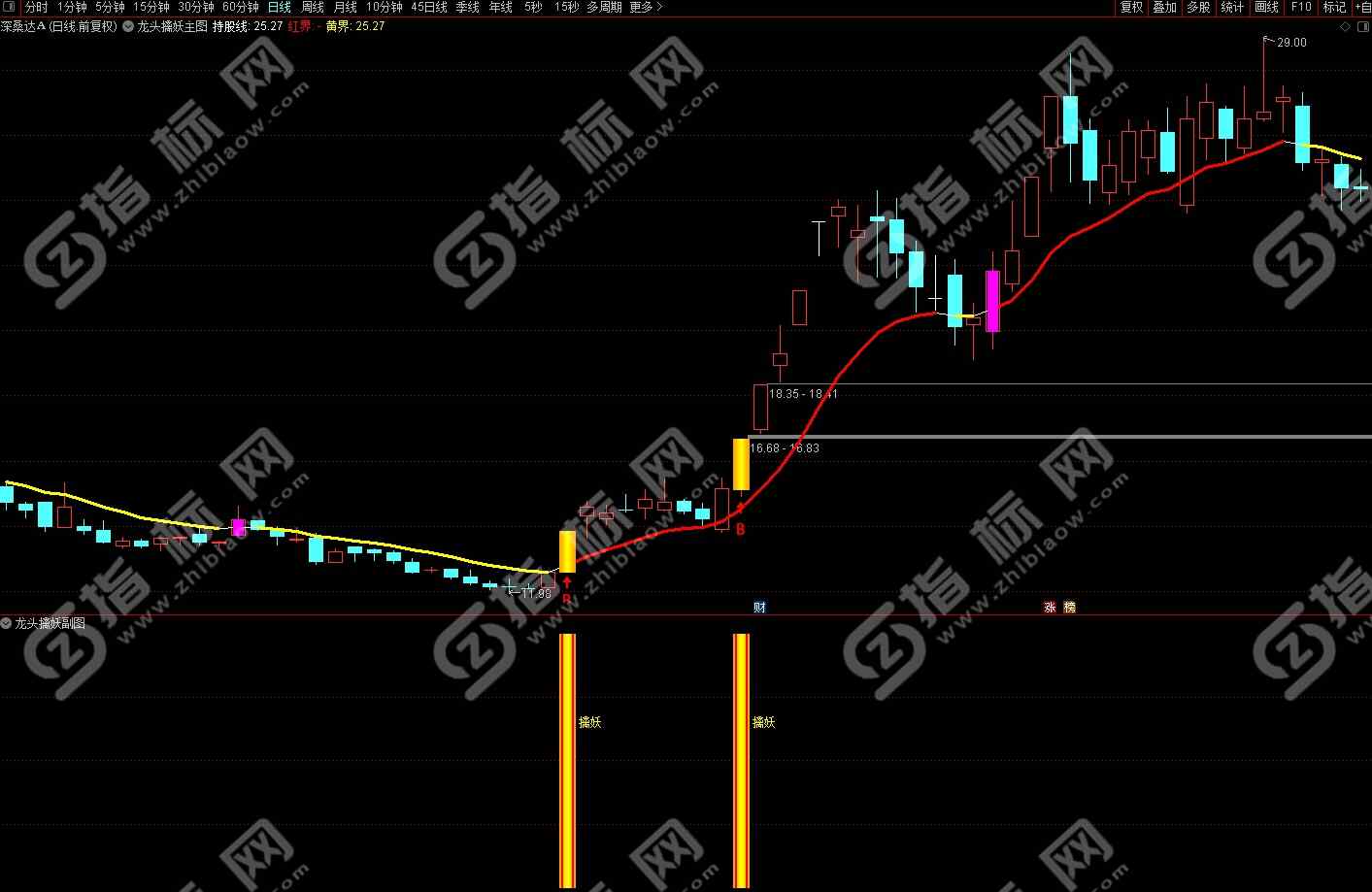 2.龙头擒妖主图指标有黄色的下降趋势线(黄界)和红色的上升趋势线(红界)以及黄K线和粉K线组成;